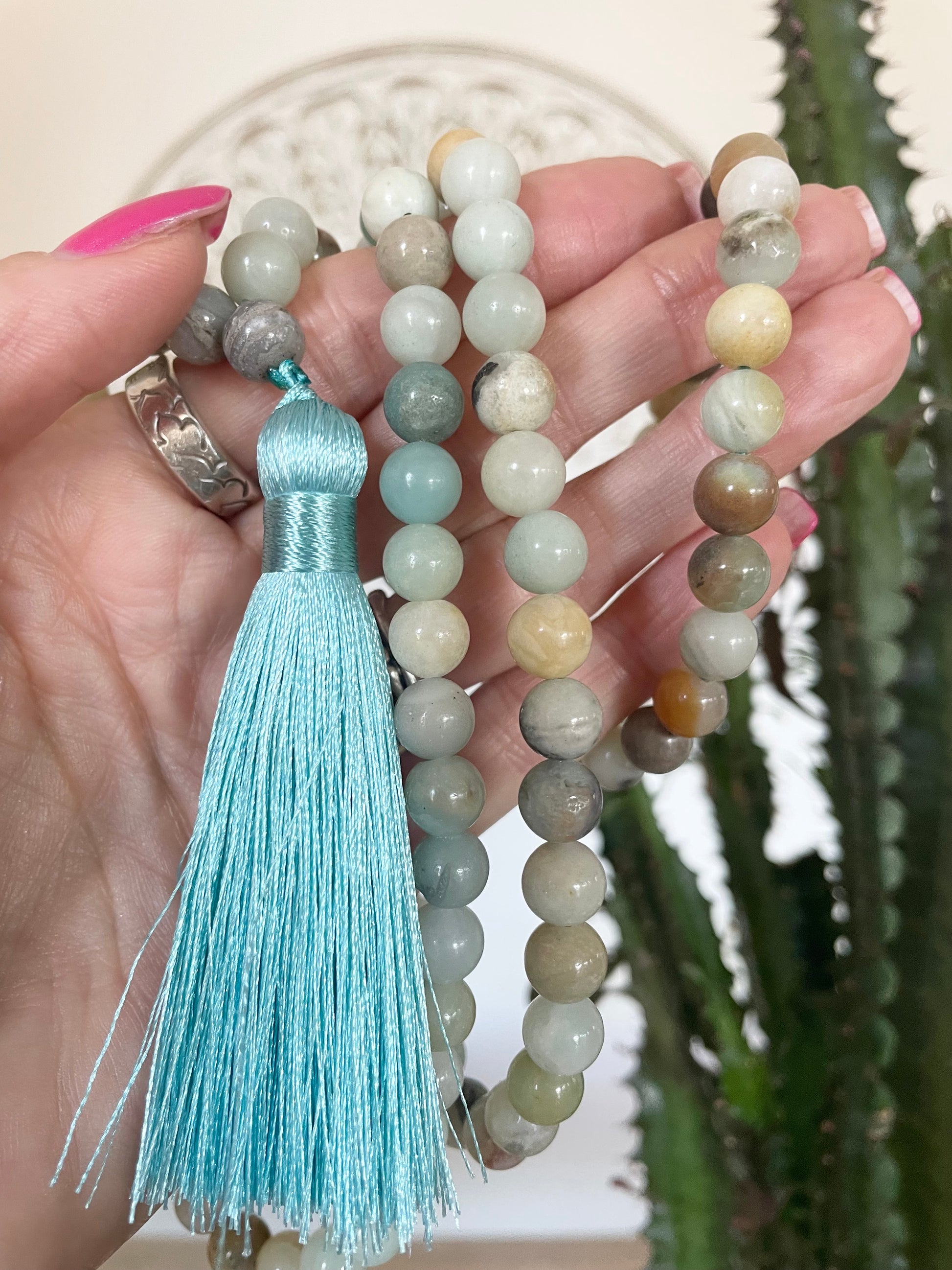 8mm gemstones with knotting in-between, larger guru bead and tassel
