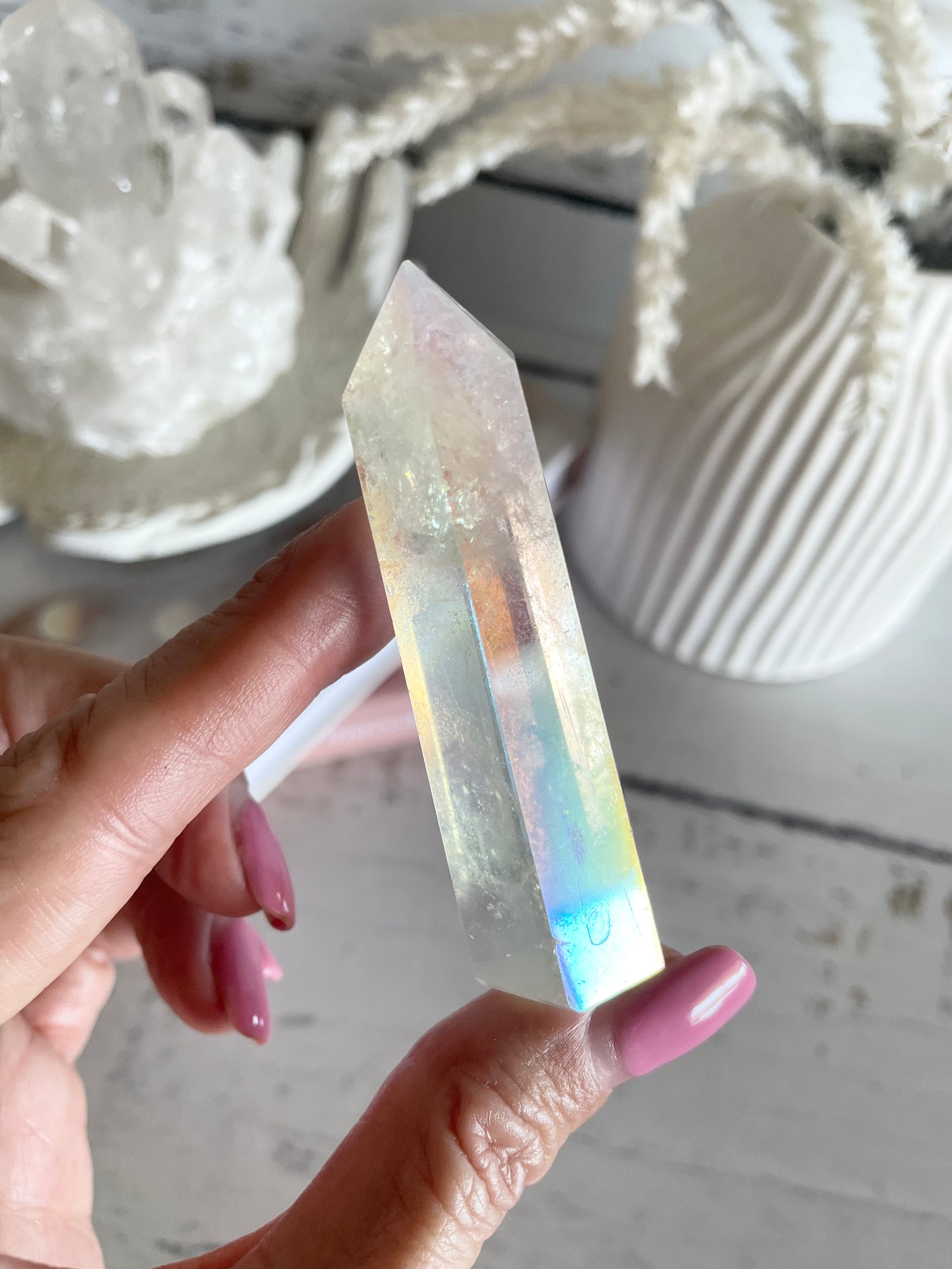 Aura is clear or fire/ice Quartz uartz that has been heated with extreme high temperatures and blended with a fine layer of titanium and niobium. Here’s the low down:
