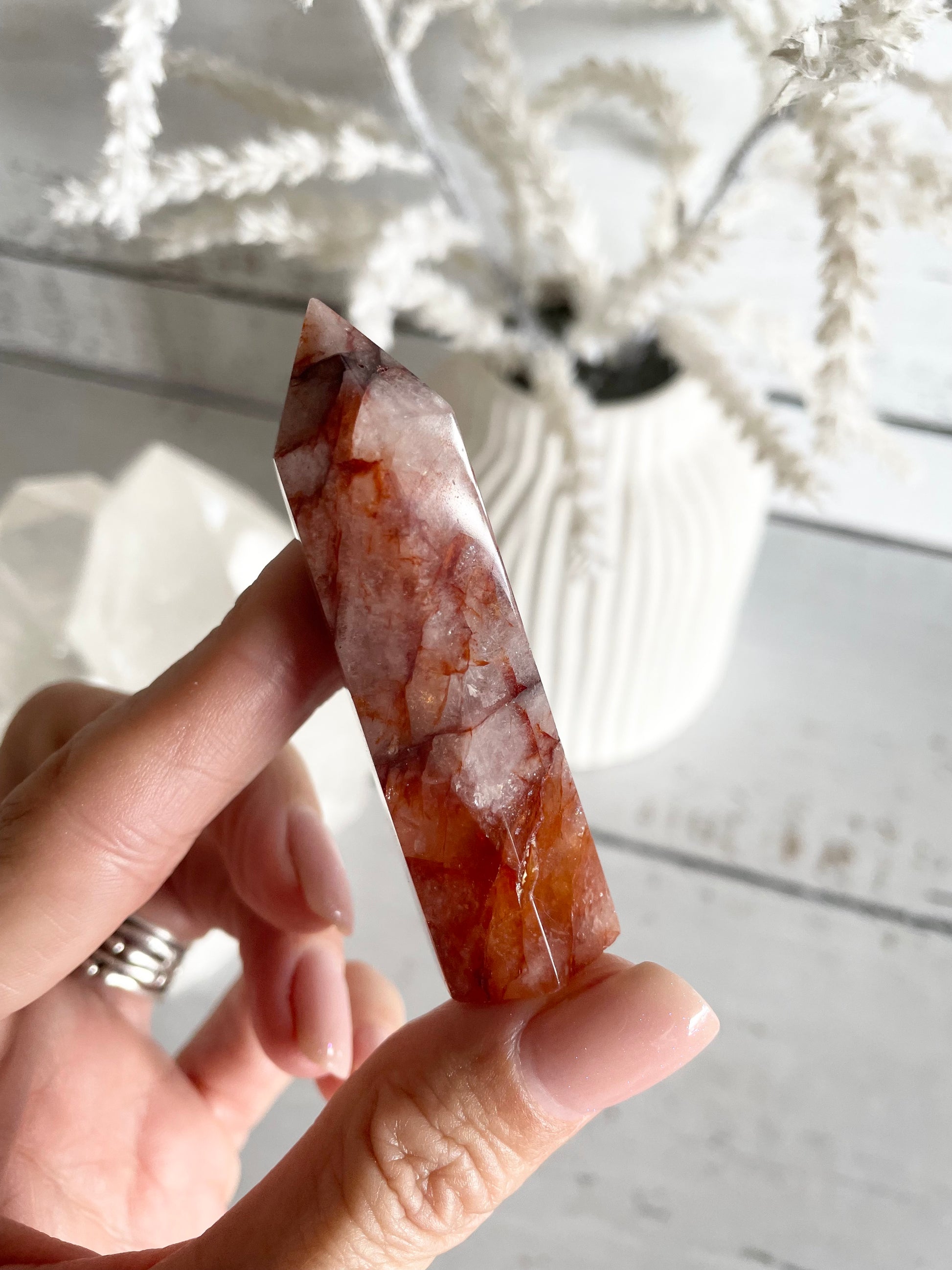 Hematoid or Fire Quartz contains both properties of Clear Quartz and Hematite to allow a fusion of balancing power and white light rays