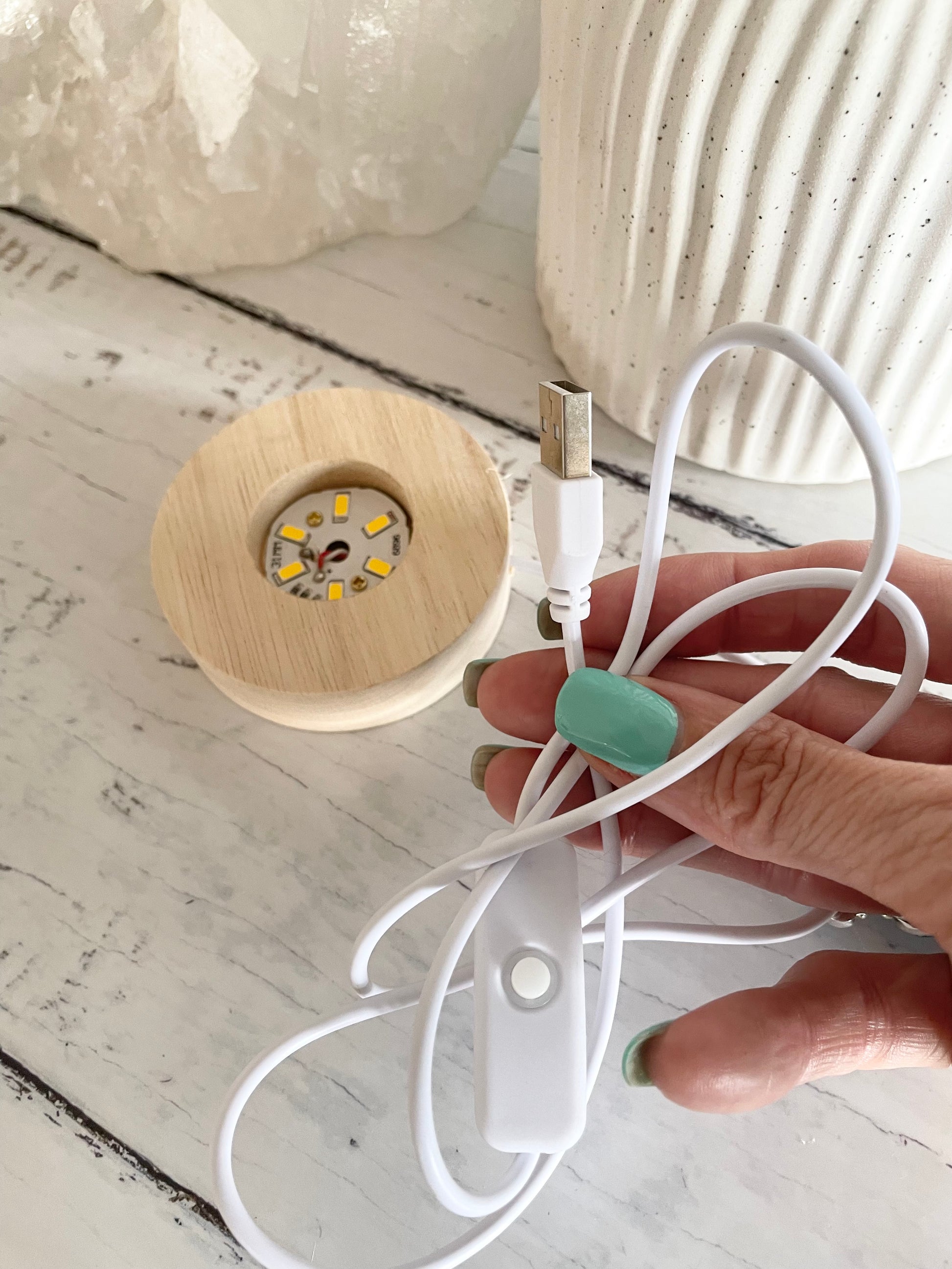 The orb sits perfectly in its wooden holder, casting a mesmerising glow!