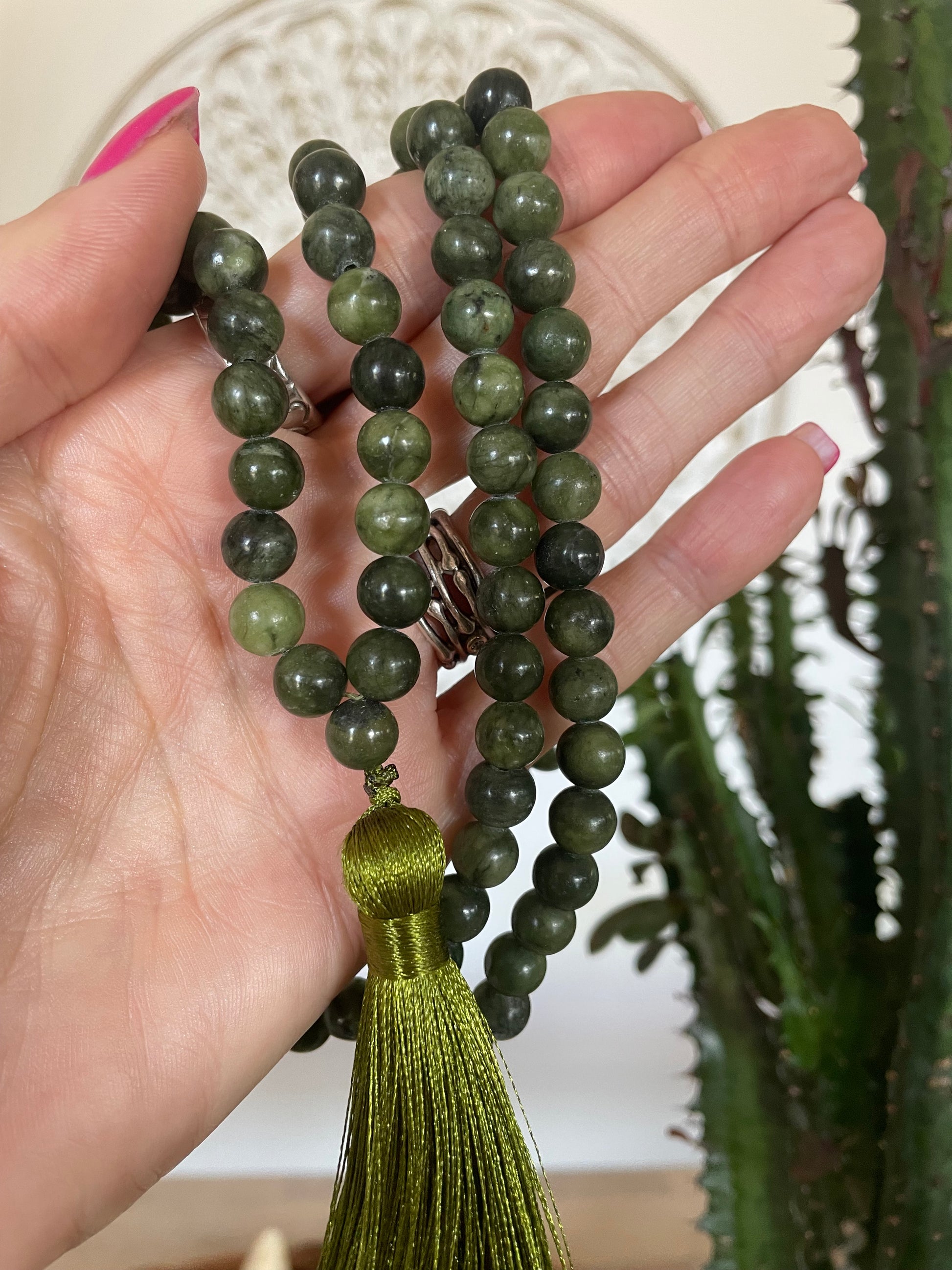 8mm gemstones with knotting in-between, larger guru bead and tassel