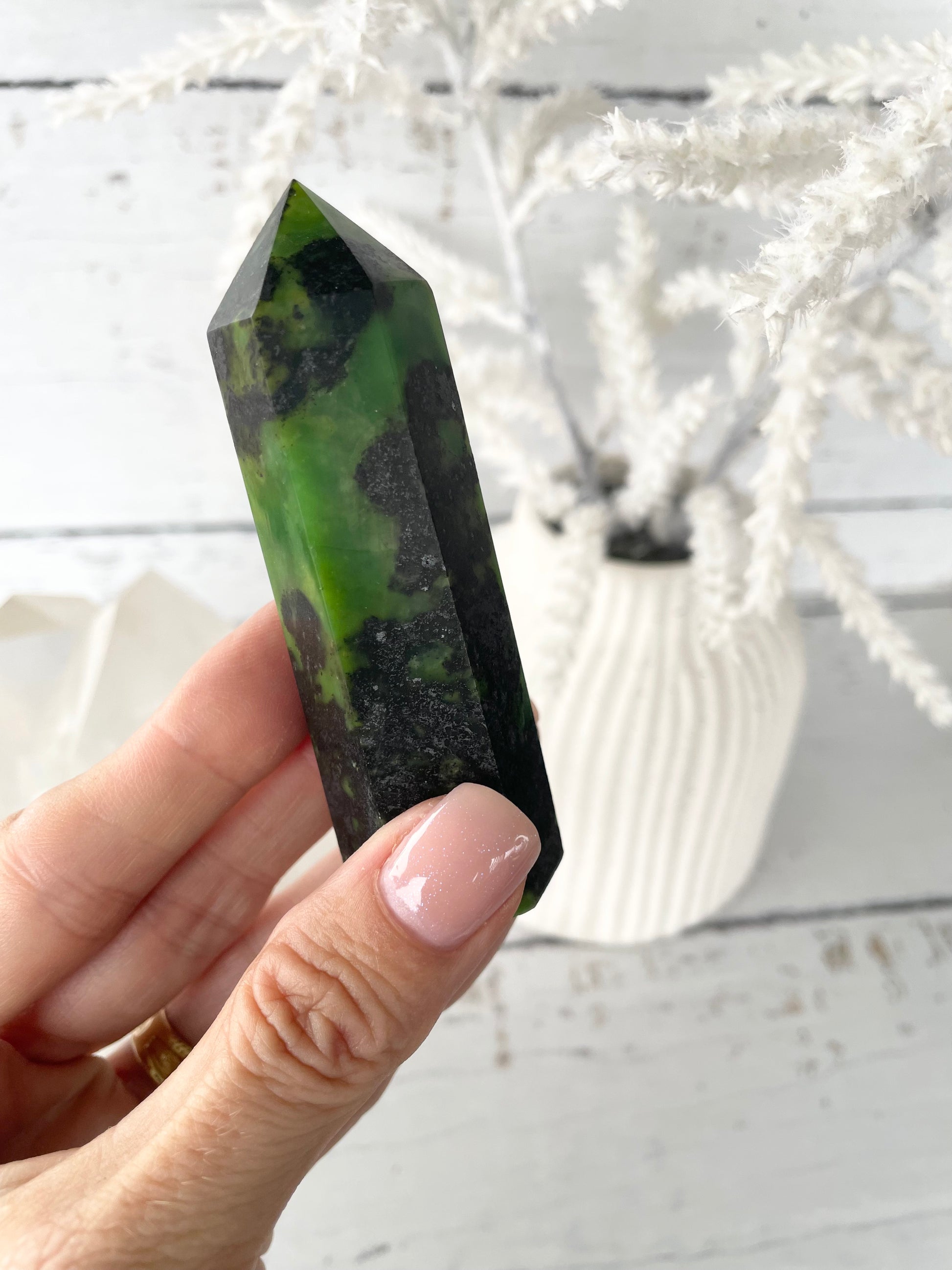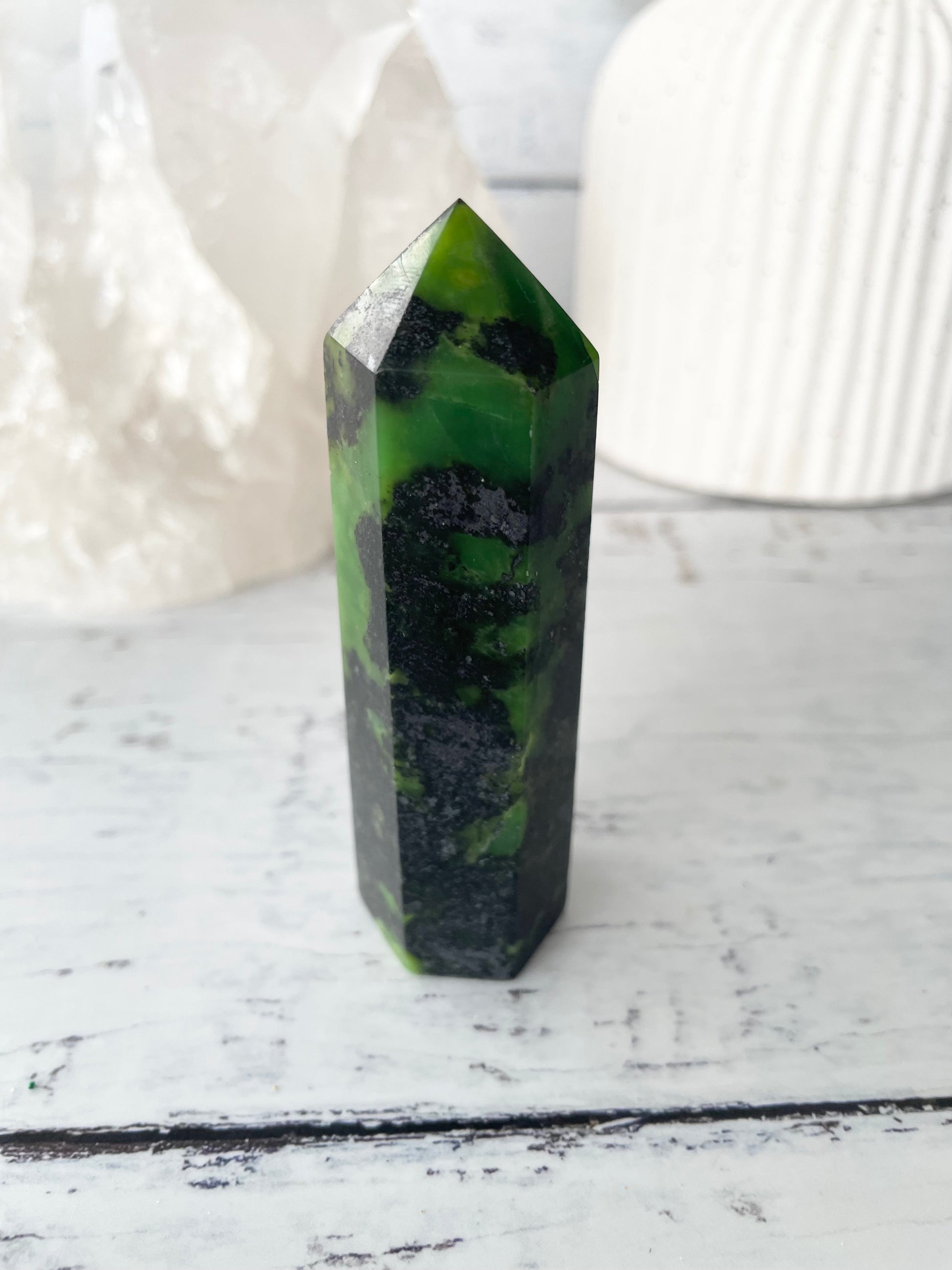 This amazing coloured crystal is a form of Serpentine and shares very similar properties and healing benefits