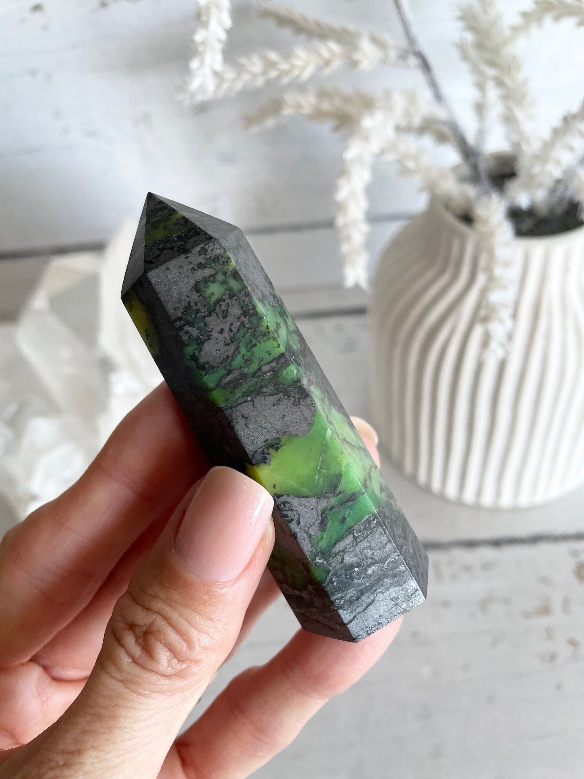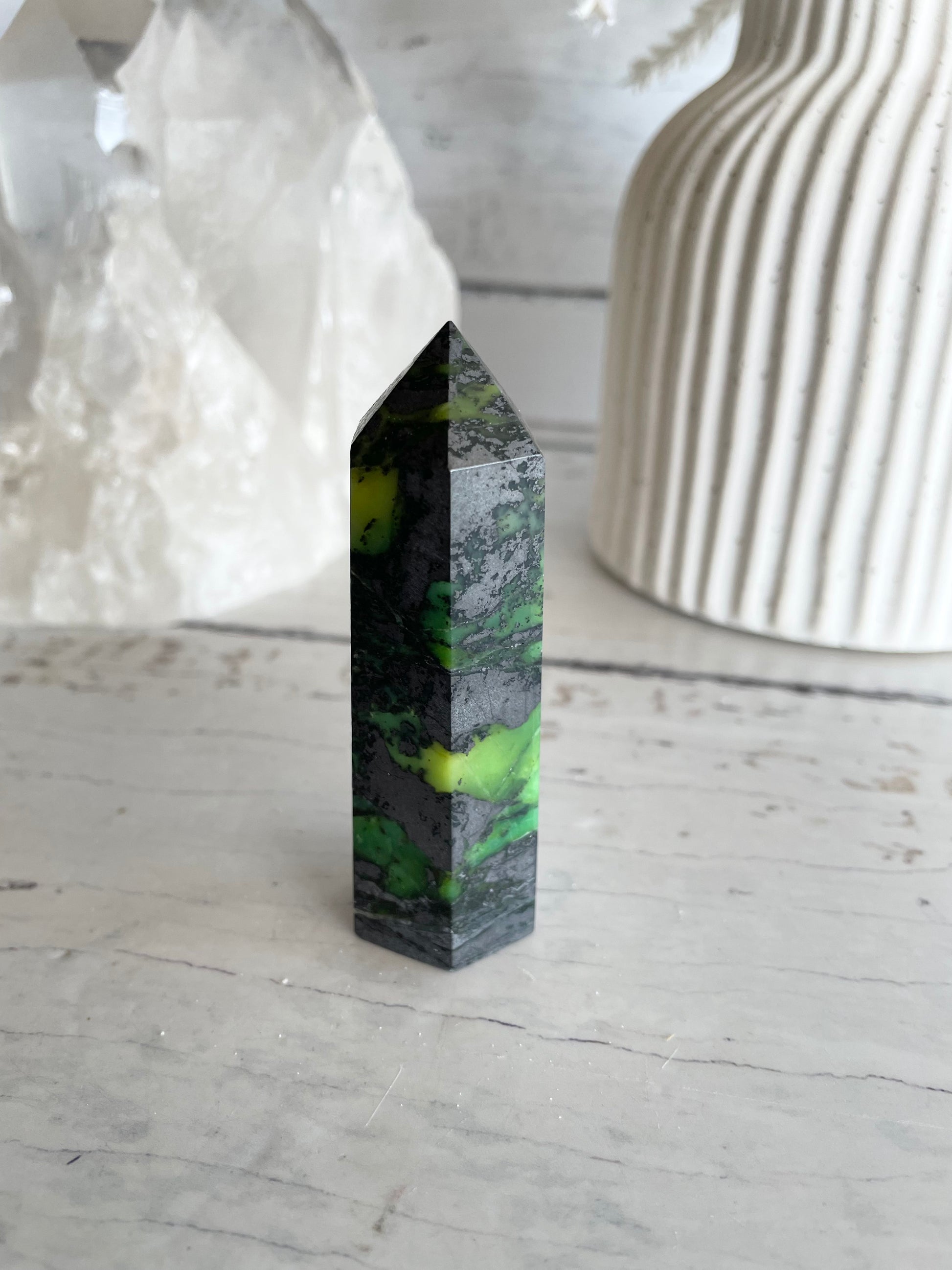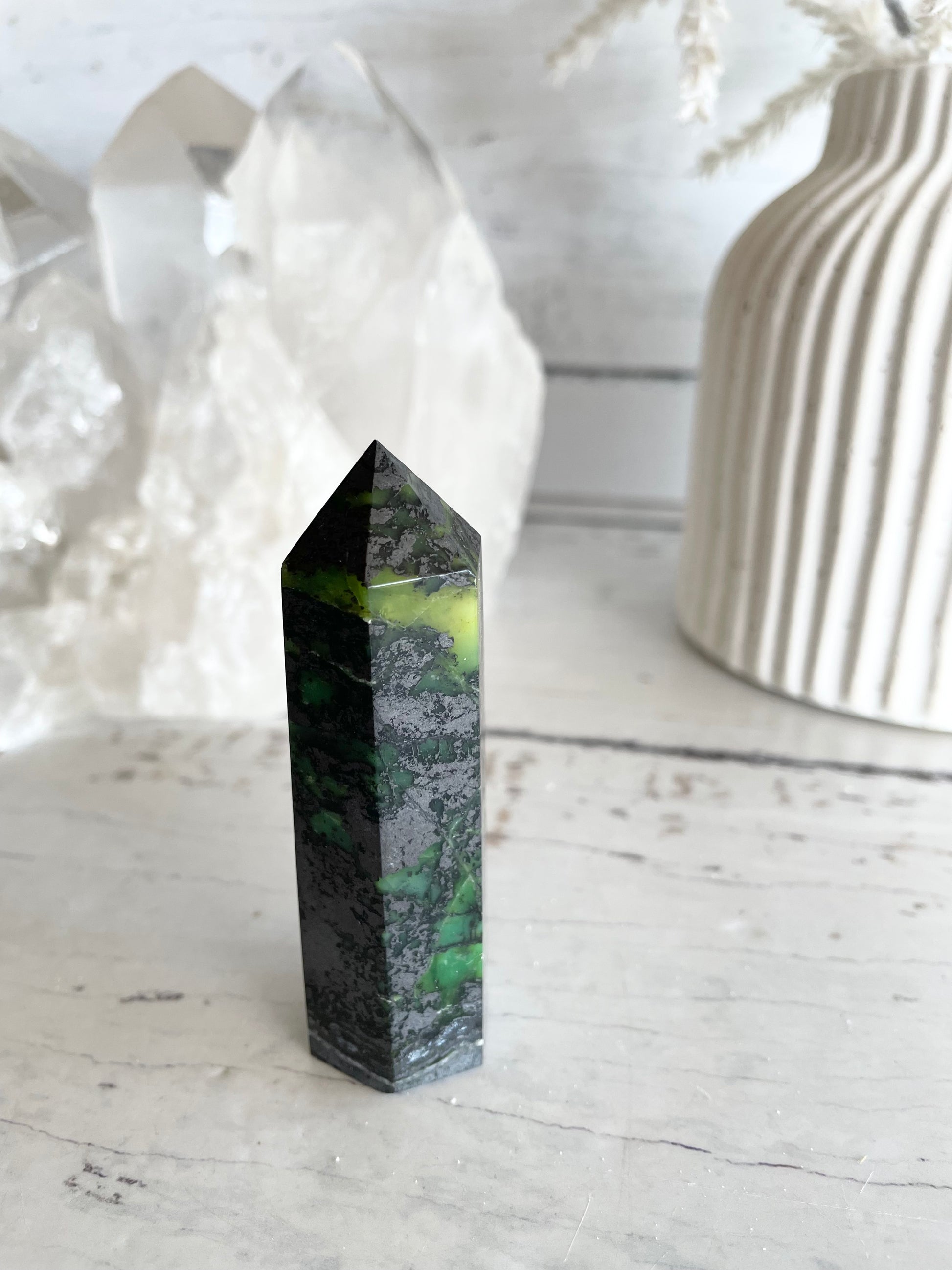 This amazing coloured crystal is a form of Serpentine and shares very similar properties and healing benefits