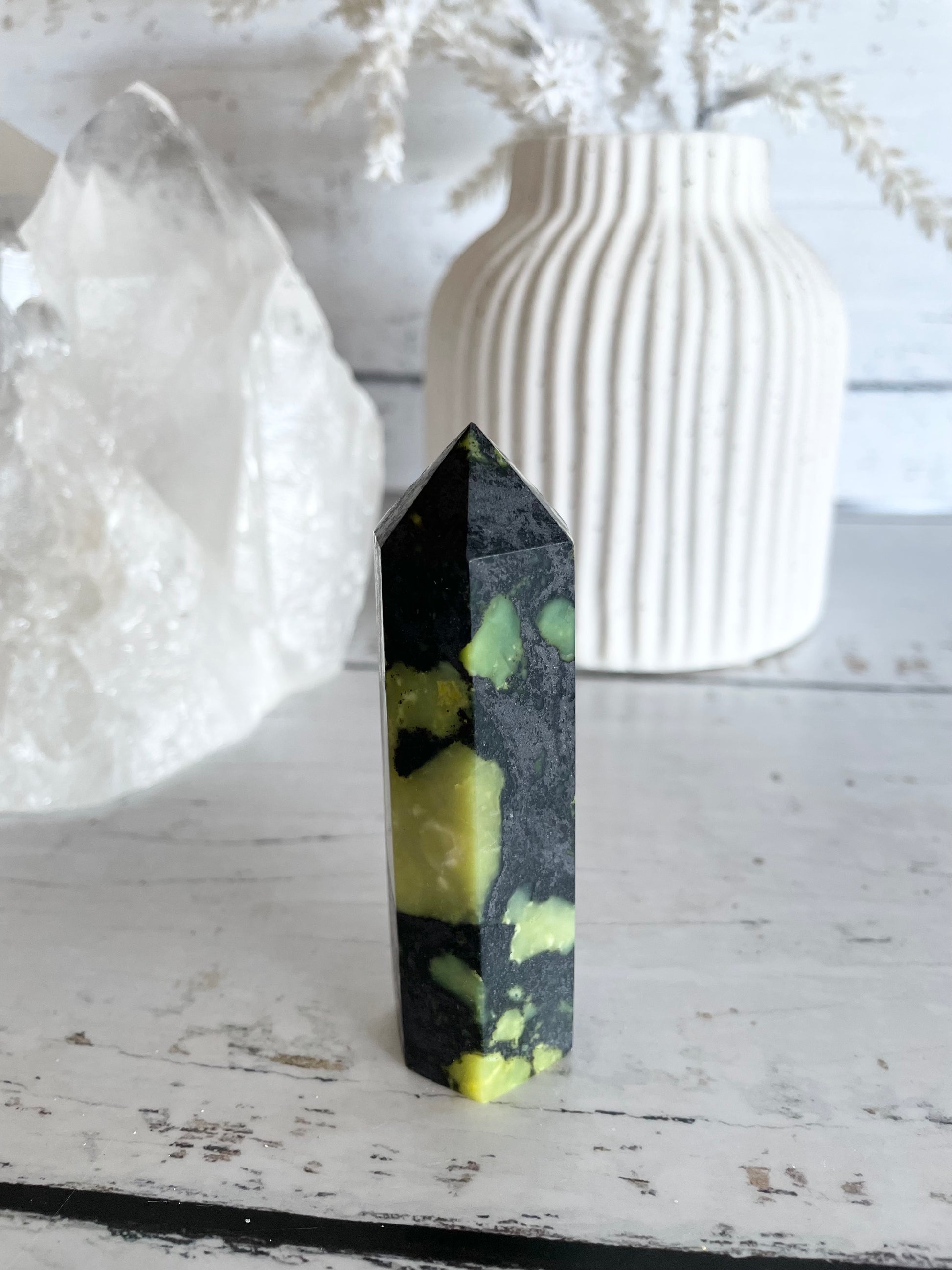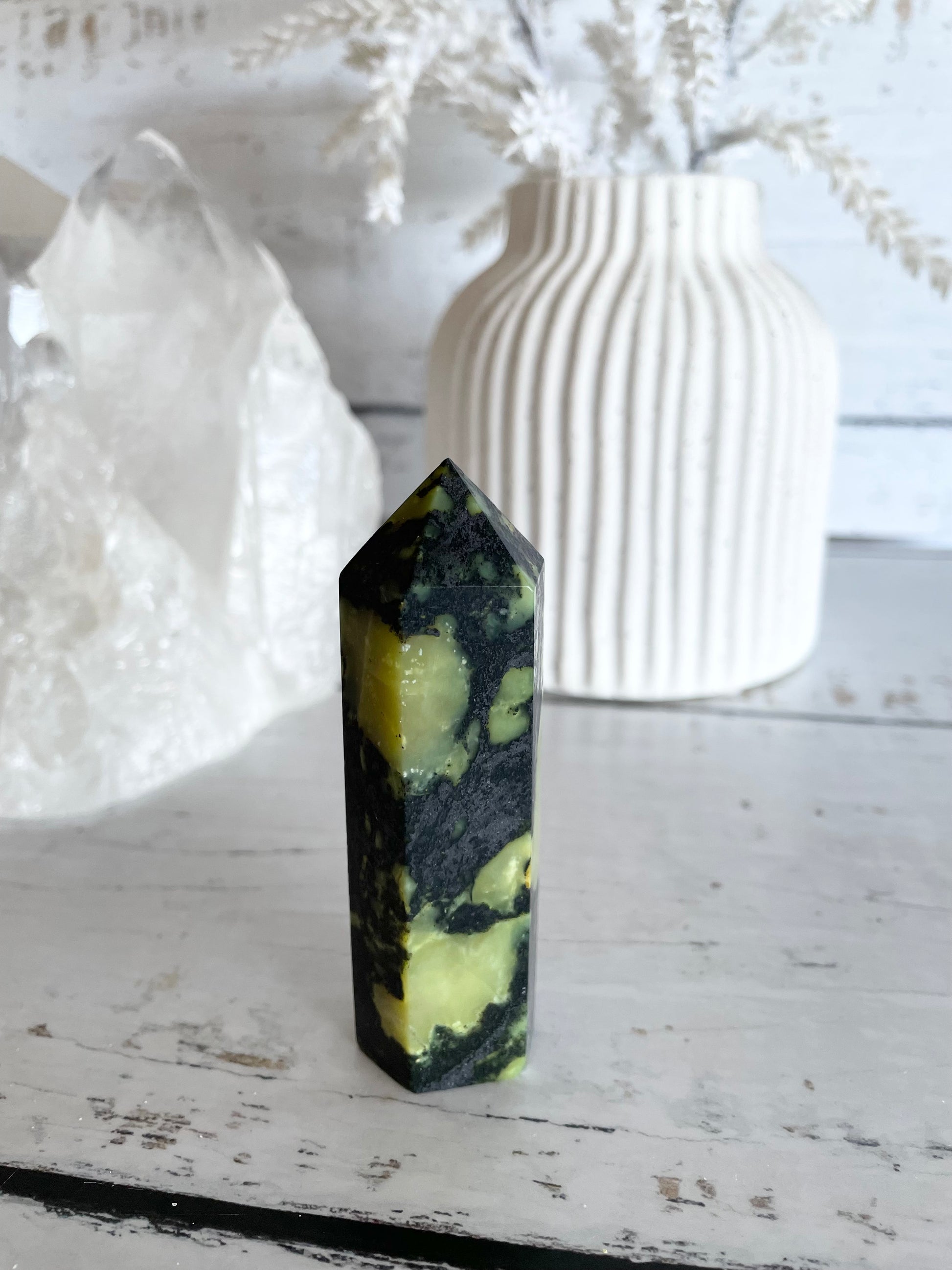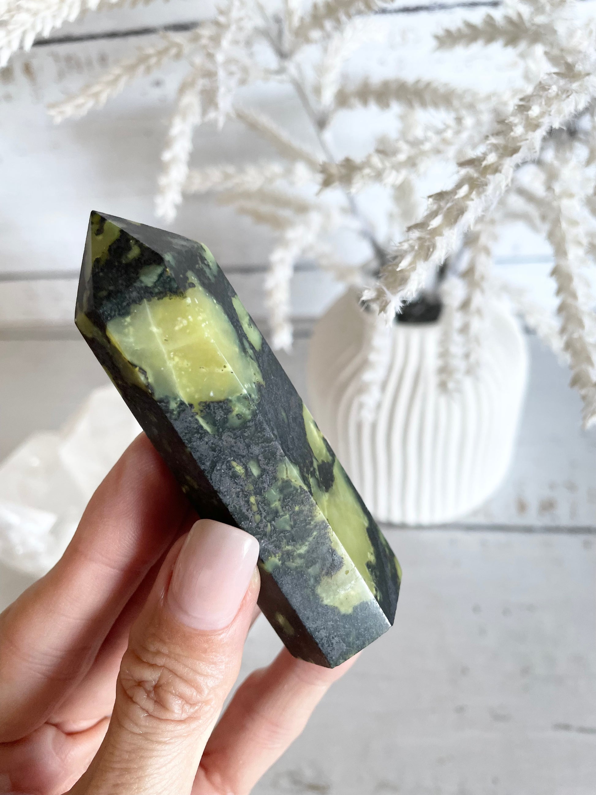 This amazing coloured crystal is a form of Serpentine and shares very similar properties and healing benefits