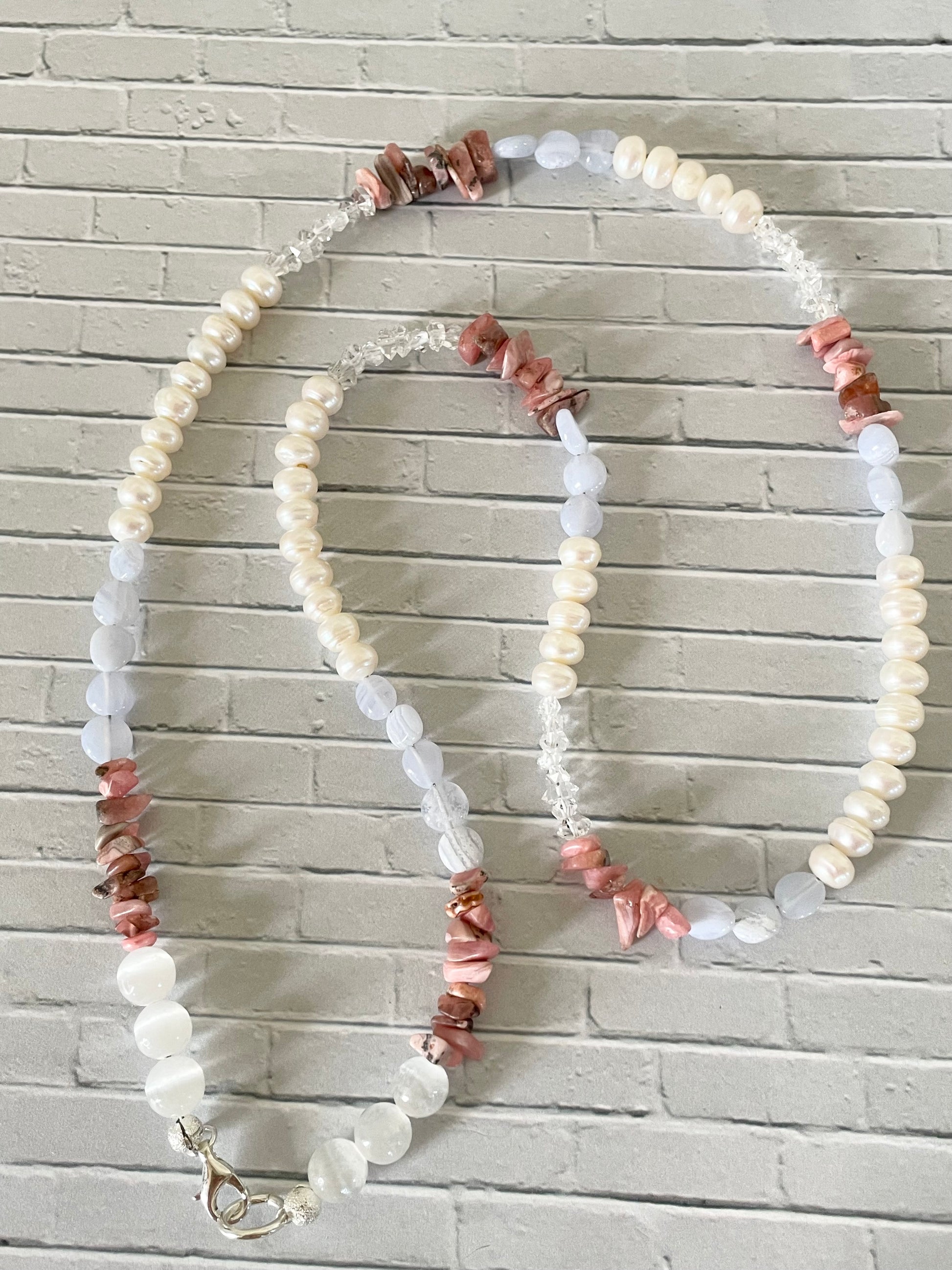 Featuring blends of freshwater pearls, pink opals, herkimer diamonds, larimar, selenite, blue lace agate, jades and jaspers!