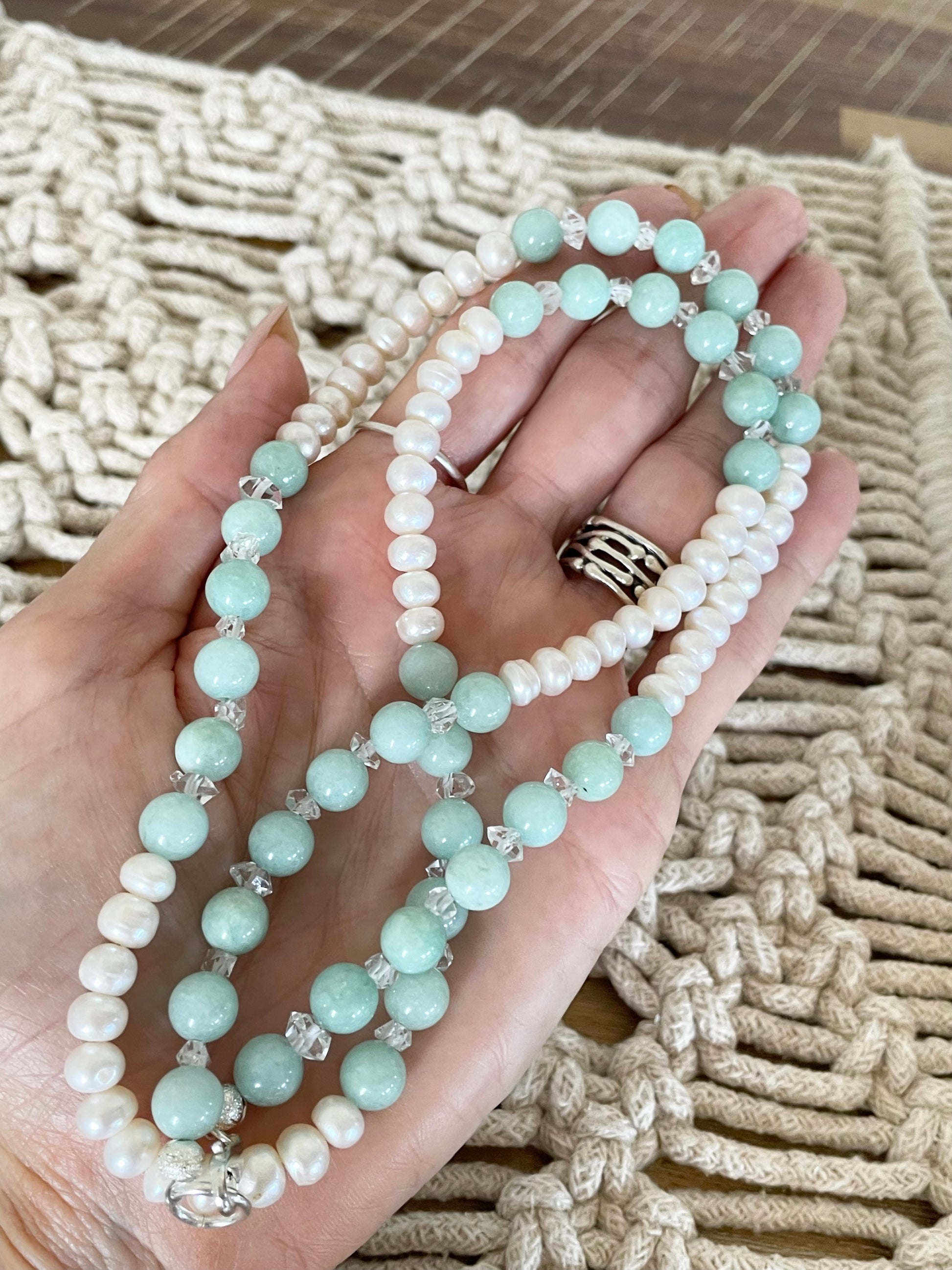 Featuring blends of freshwater pearls, pink opals, herkimer diamonds, larimar, selenite, blue lace agate, jades and jaspers!