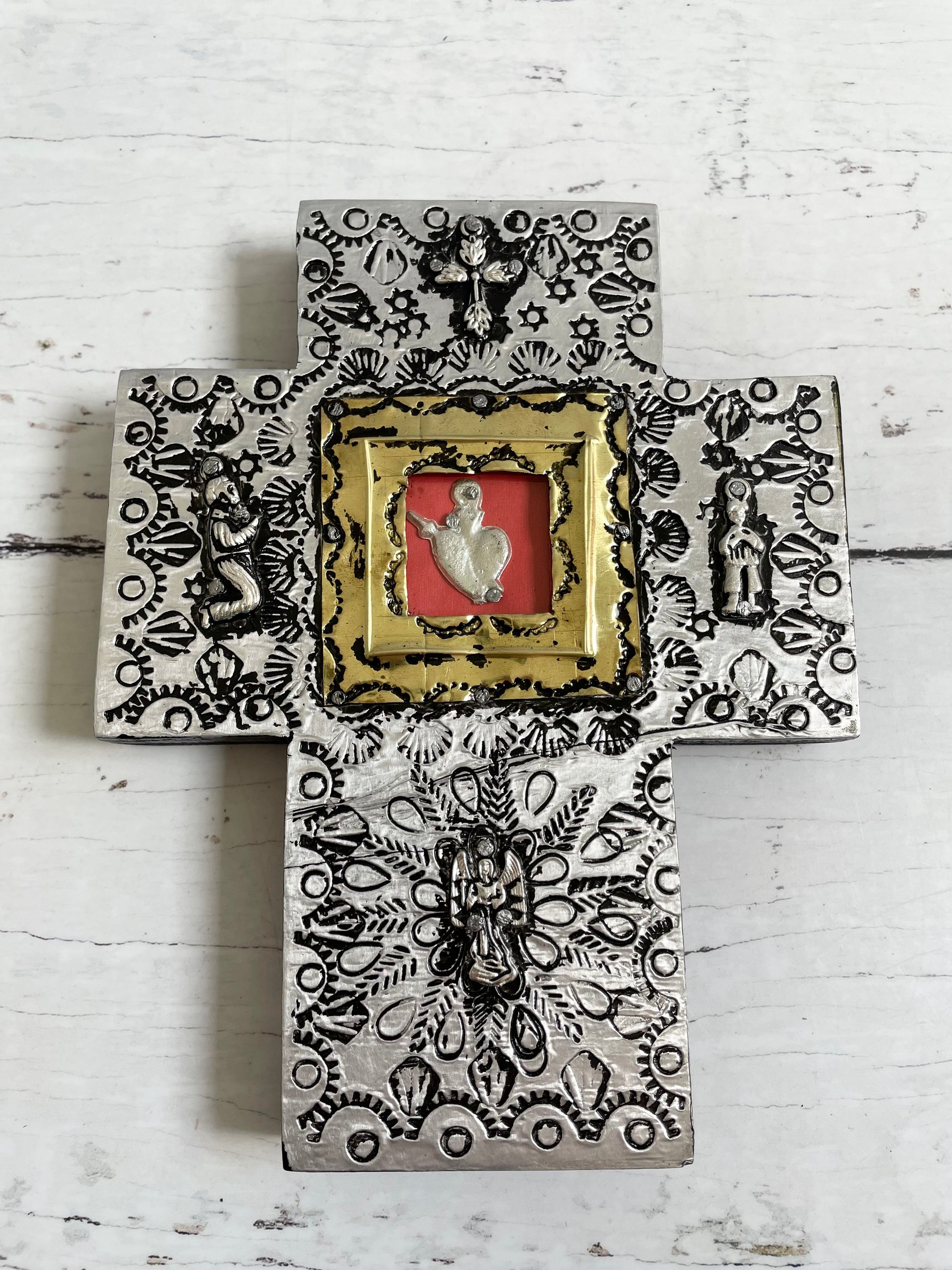 These wooden/tin folk art pieces often feature tin figures which are nailed into the design called Milagros.