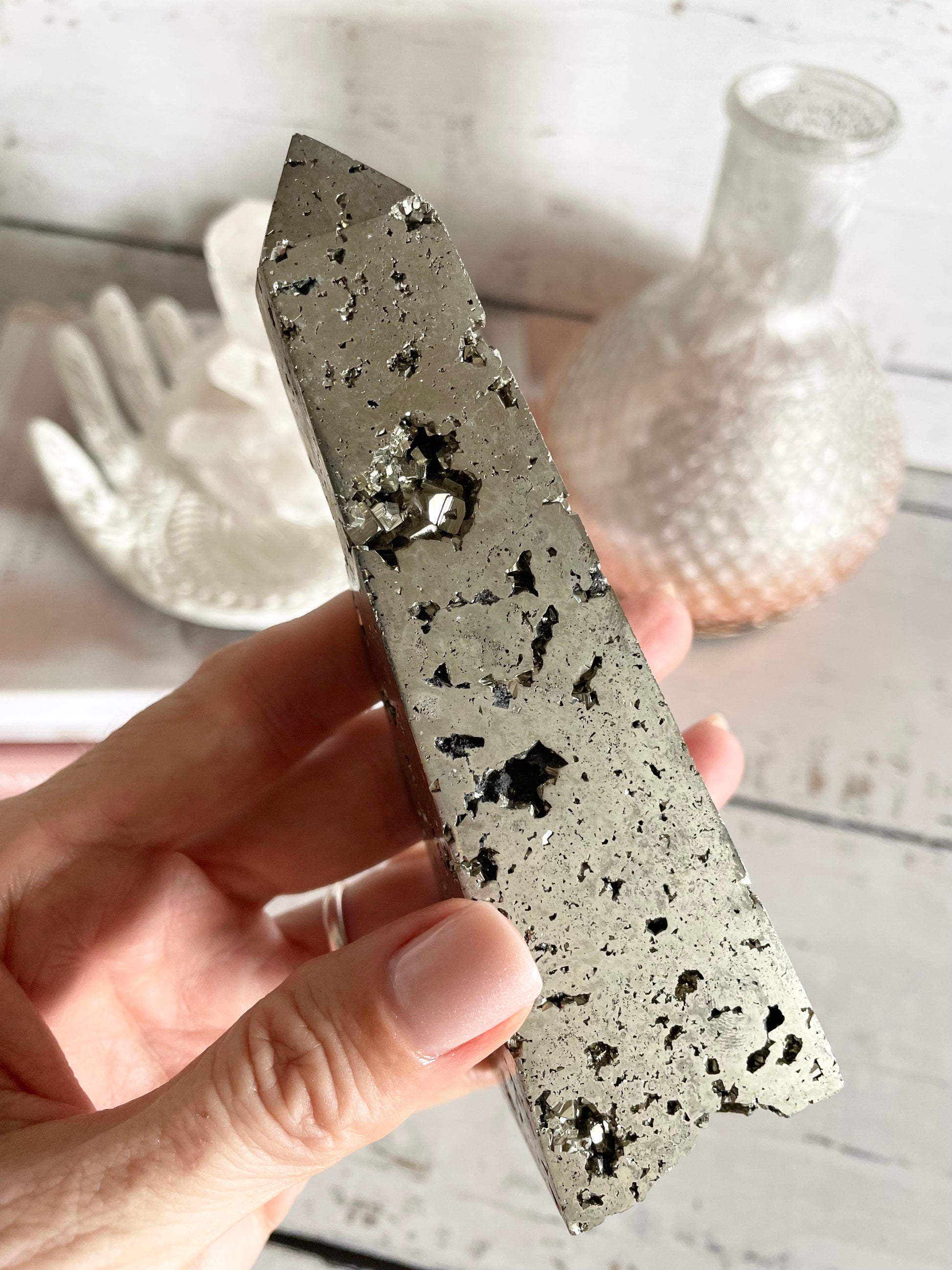 Pyrite is a protective energy and shielding stone. Carry a piece to reflect harm and danger away from your aura or keep a piece in your home surrounds. Useful if you are travelling away from home