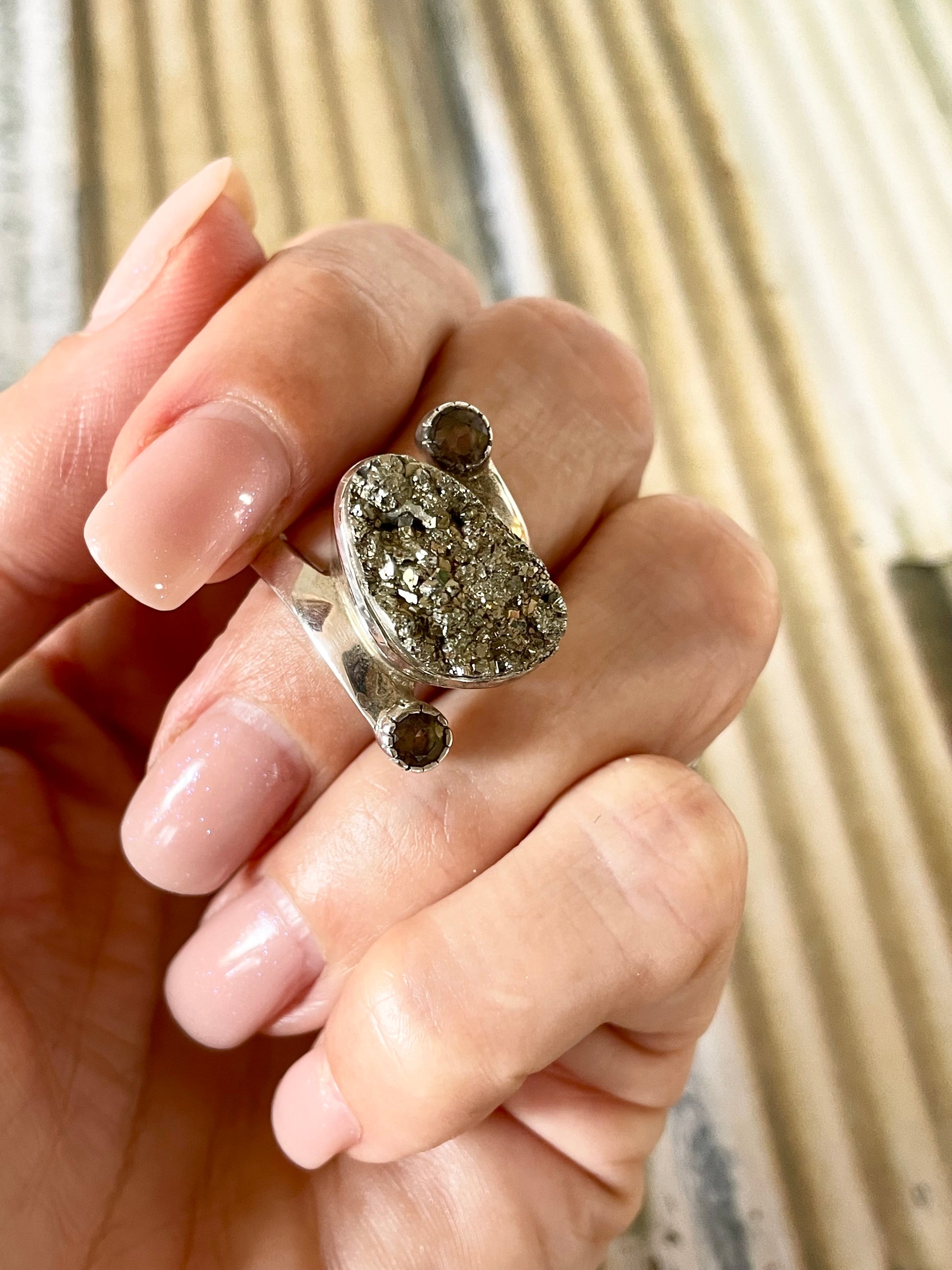 Raw Pyrite & Smoky Qtz Ring - Size 10