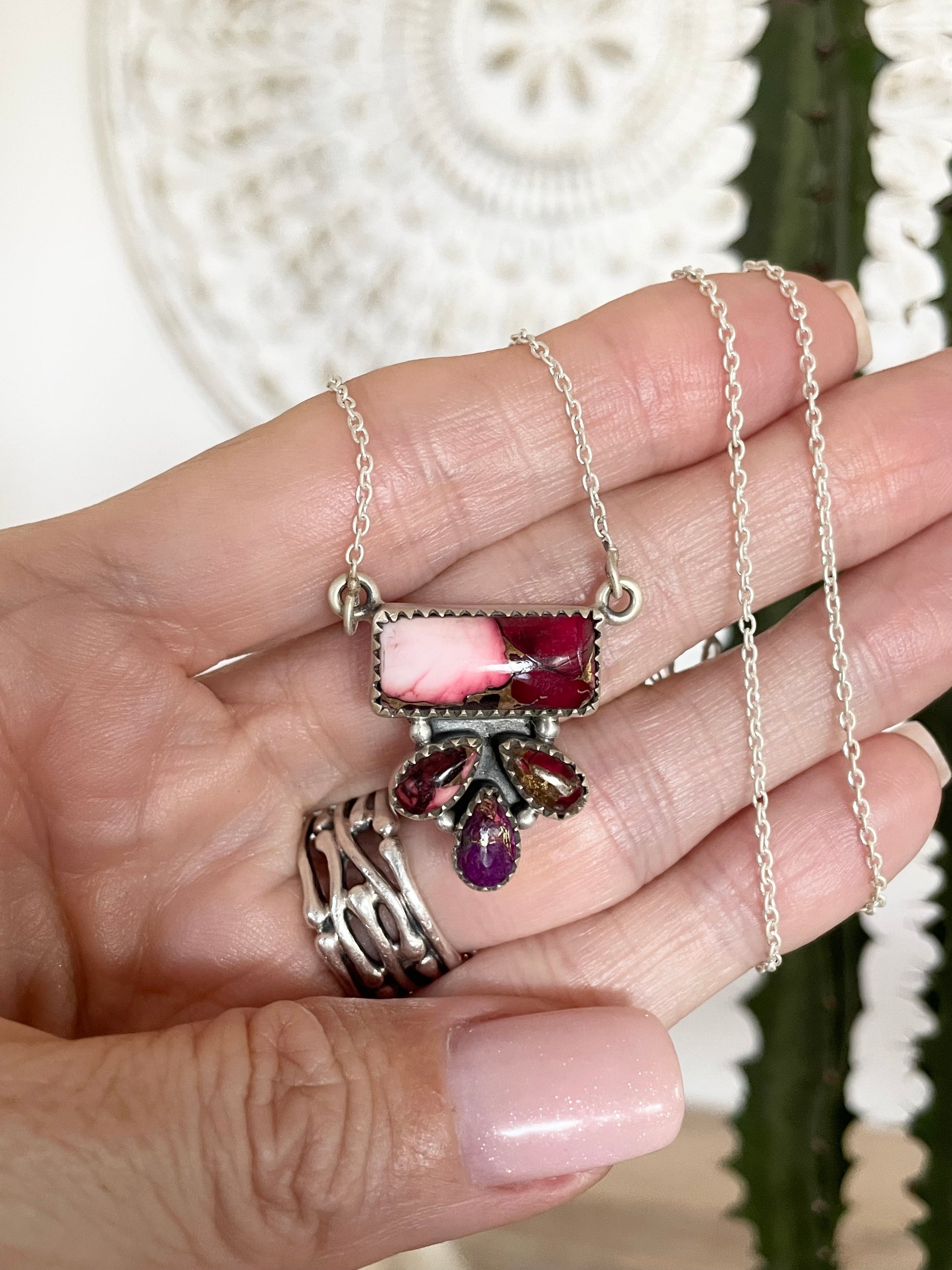 Dahlia and Cotton Candy turquoise is not a singular naturally occurring stone. This jewellery variety uses real Kingman turquoise which has natural copper inclusions. White Howlite is often included. These crystals are then stabilised for strength and often dyed to add vibrancy to their natural composition.