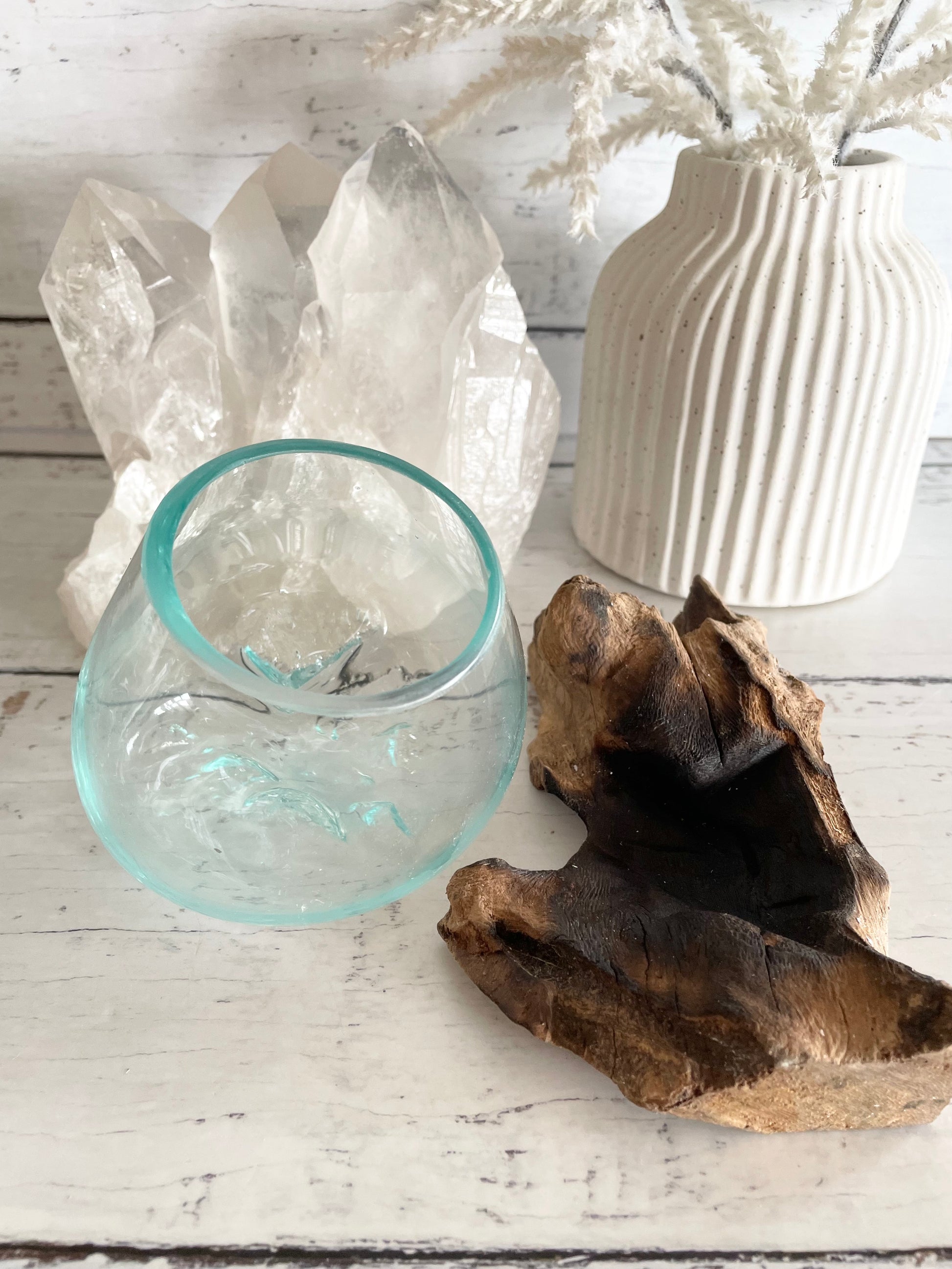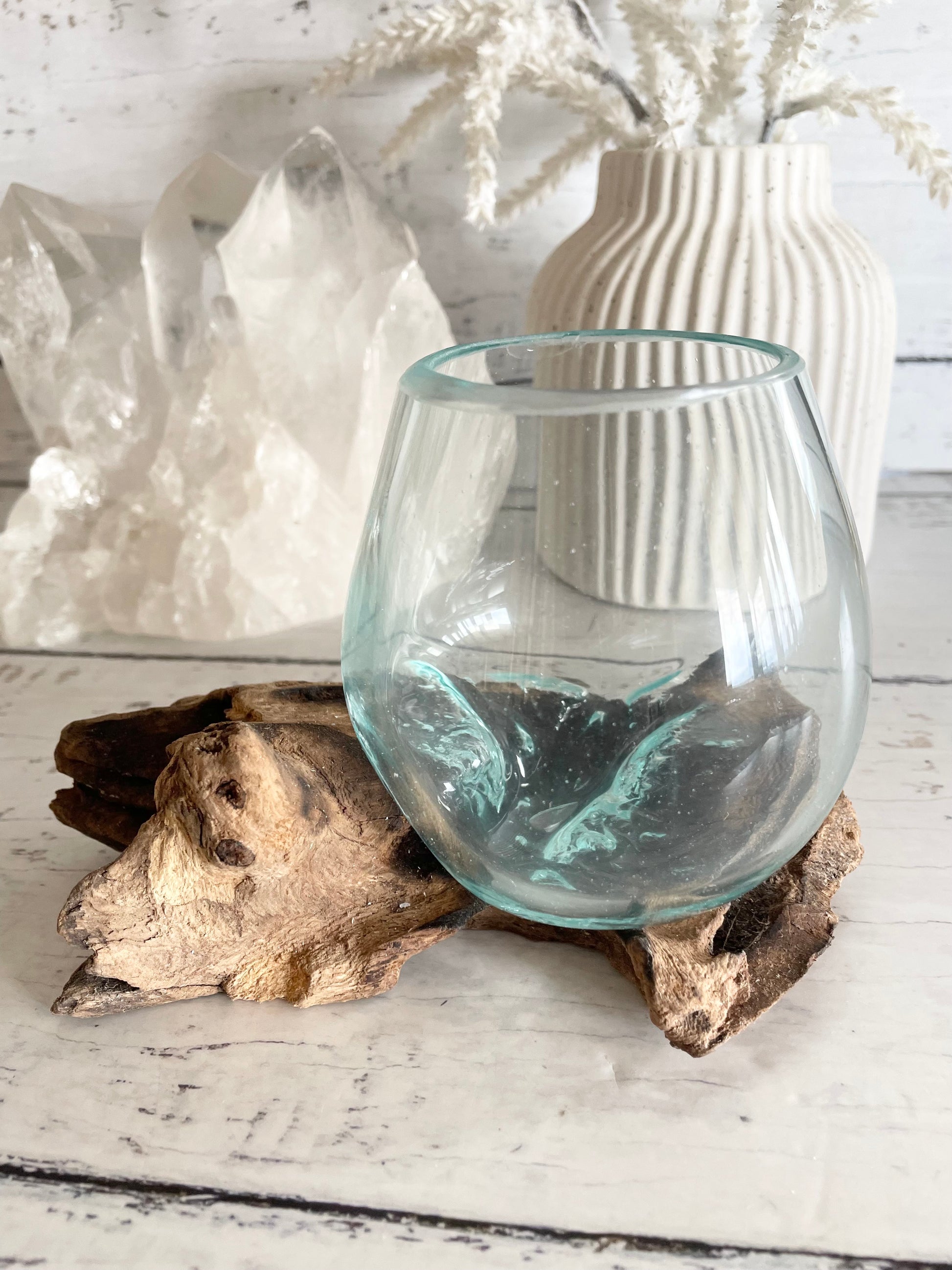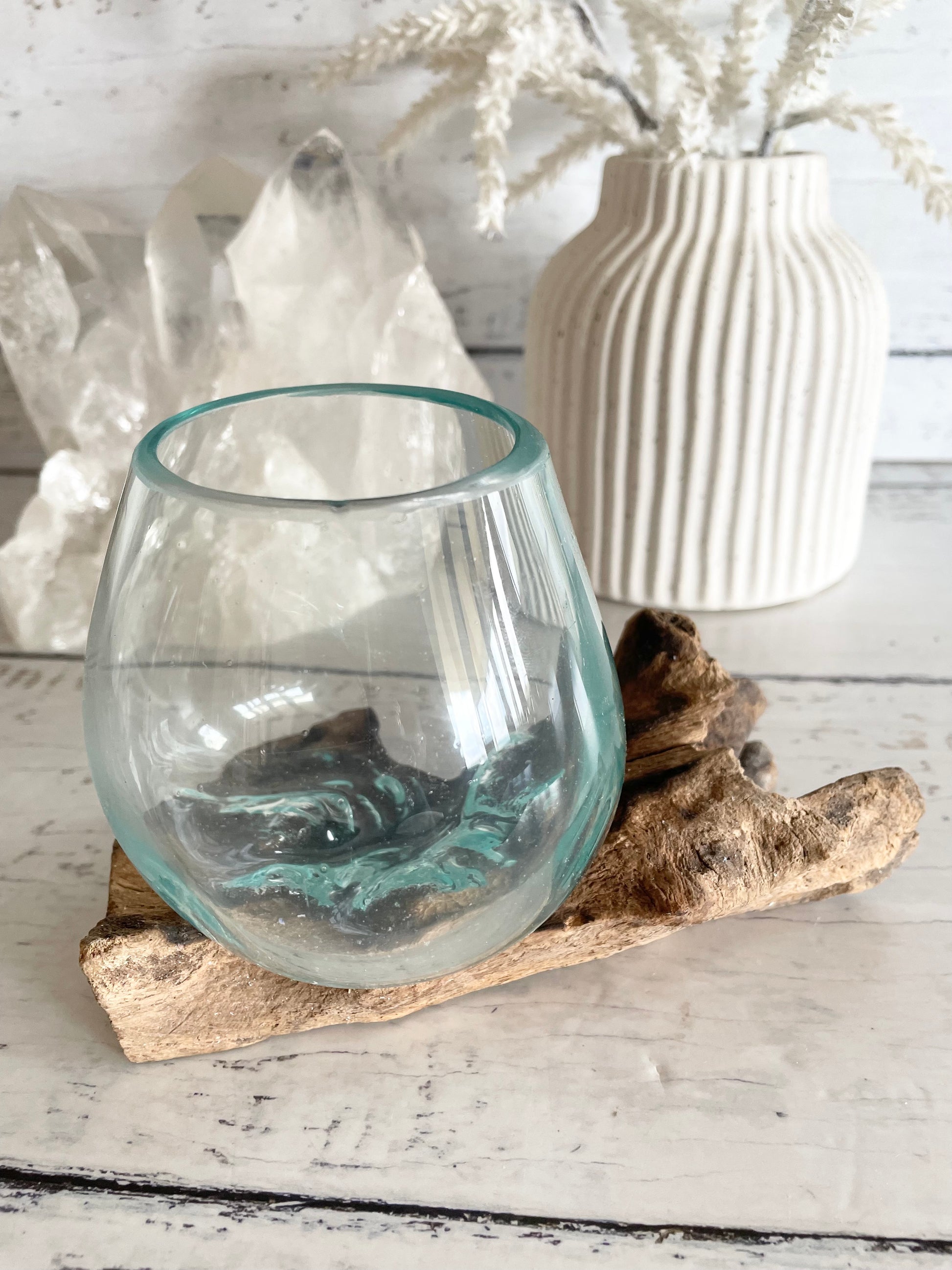 These amazing glass bowls showcase exquisite glass craftsmanship. Their base is adorned using lightweight, ethical collected driftwood. The glass rests securely in small grooves, perfectly positioned. I've used mine for plants, and they flourish. Particularly pothos in water!