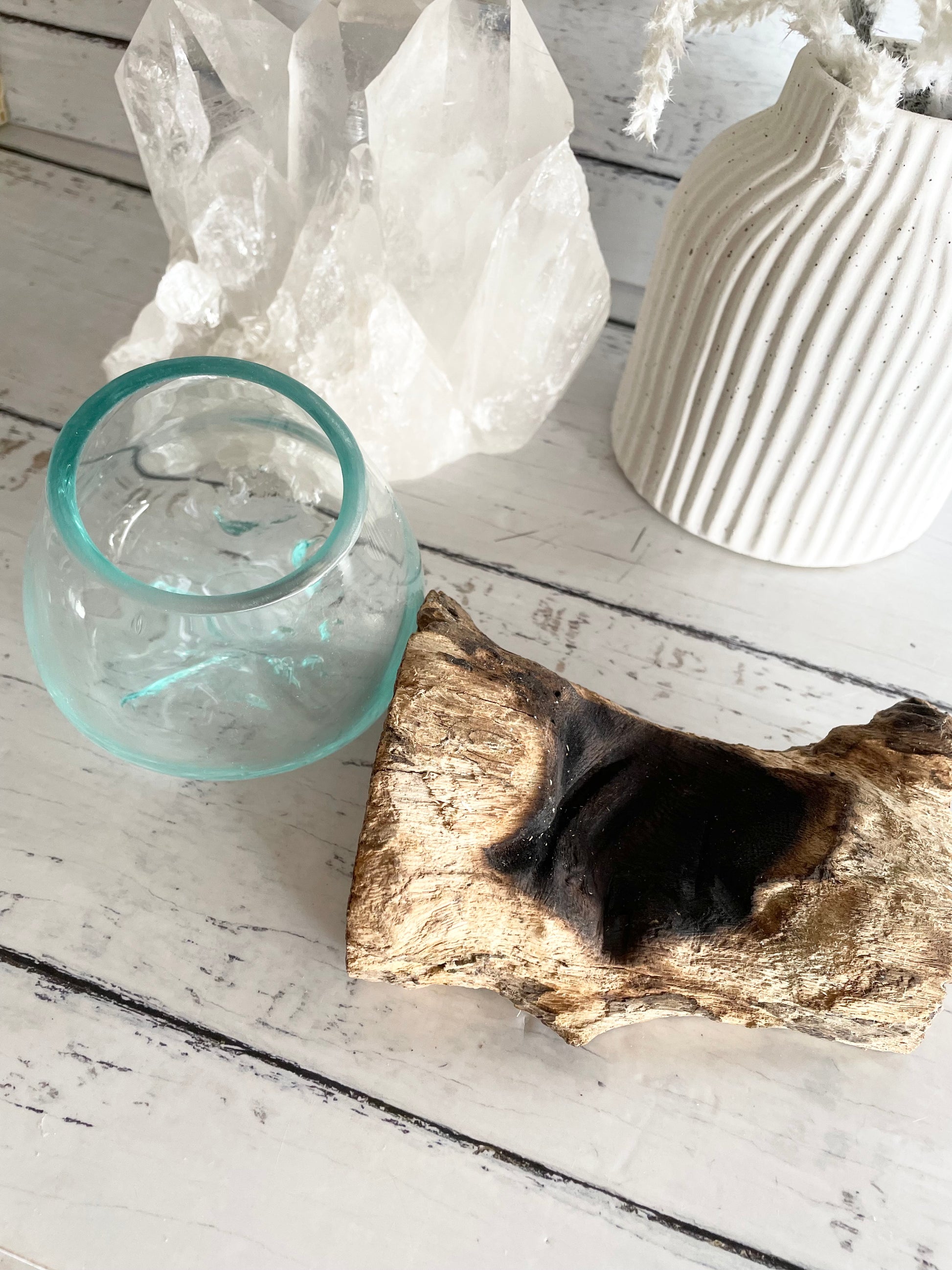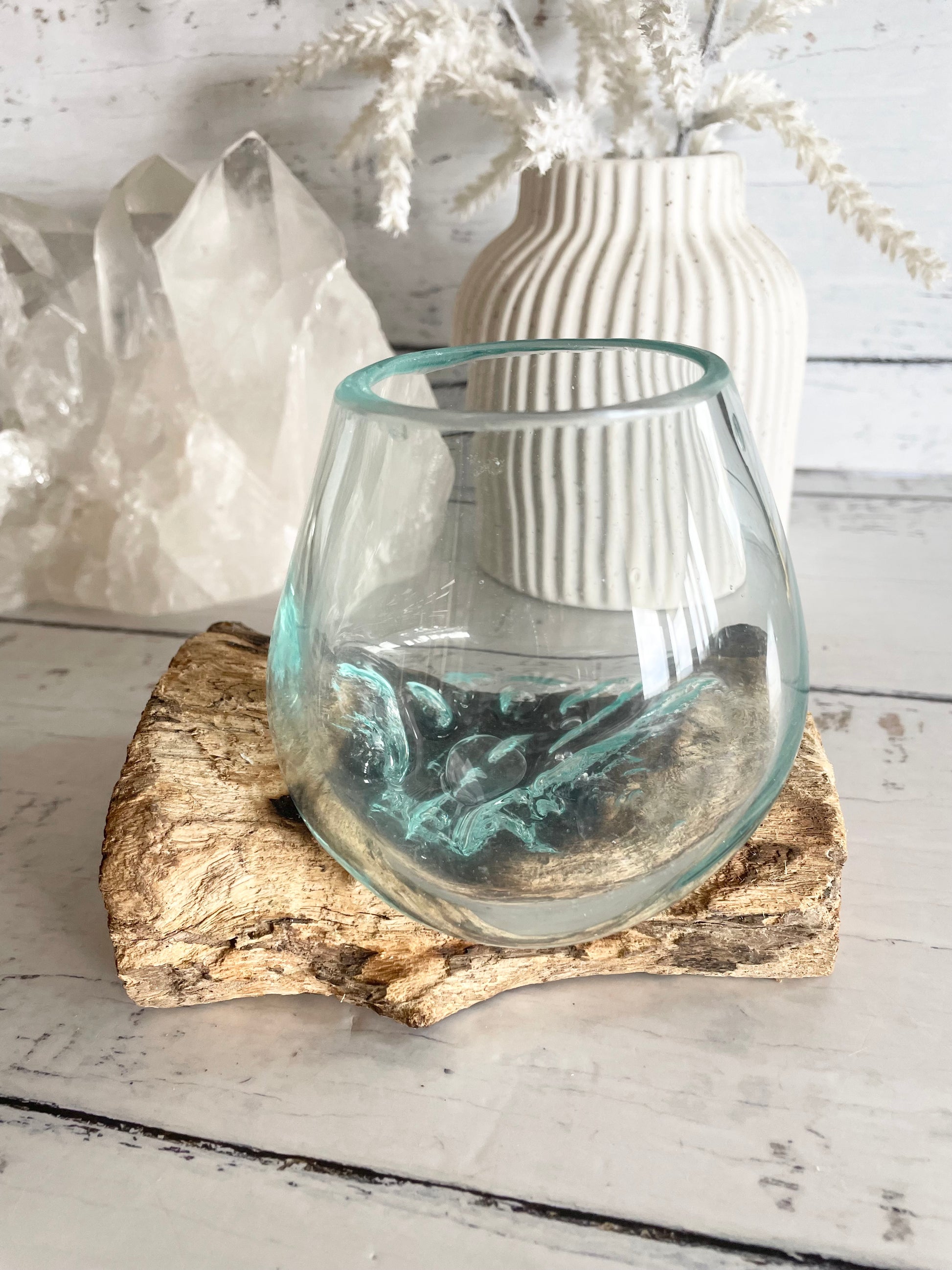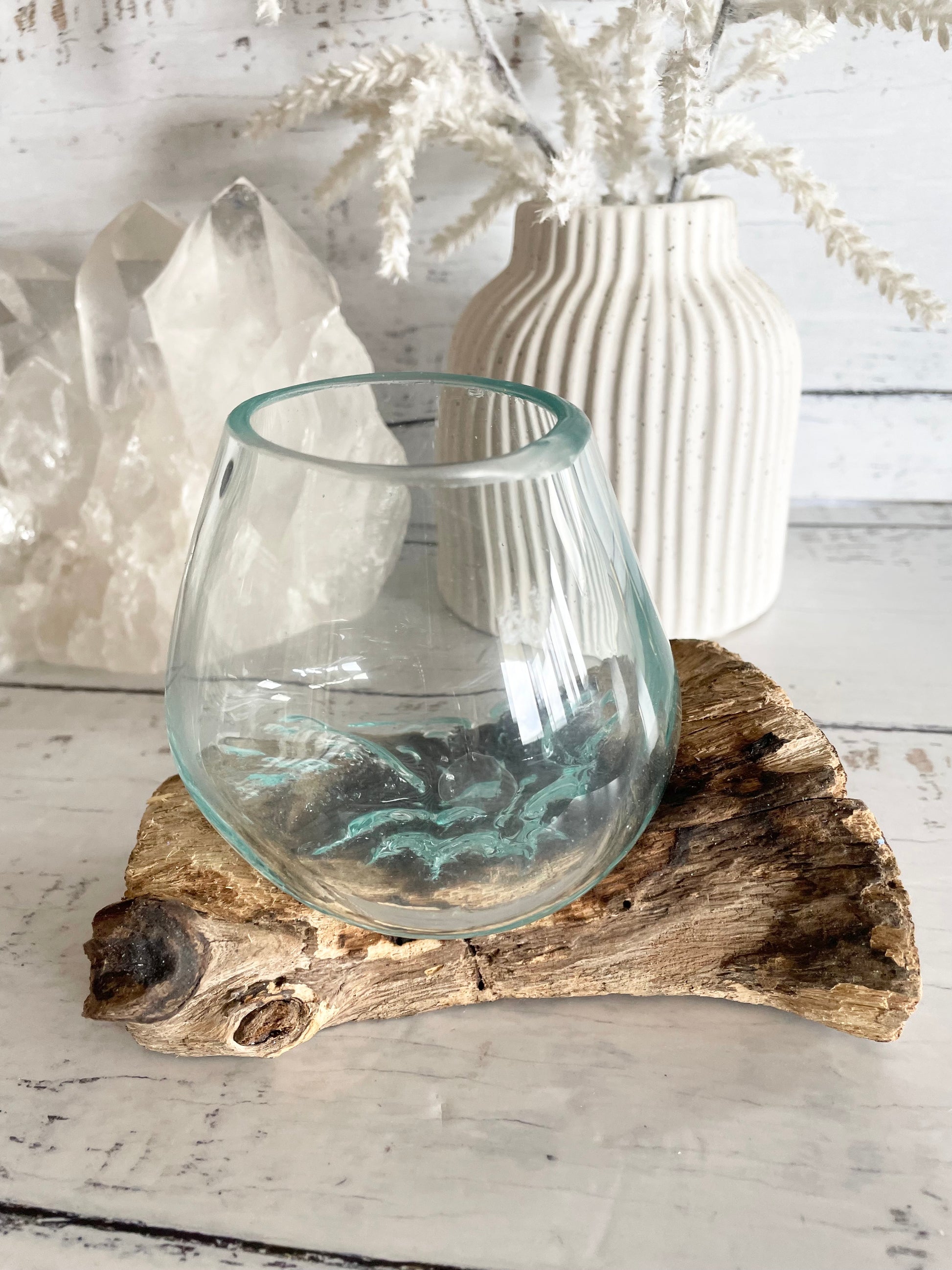 These amazing glass bowls showcase exquisite glass craftsmanship. Their base is adorned using lightweight, ethical collected driftwood. The glass rests securely in small grooves, perfectly positioned. I've used mine for plants, and they flourish. Particularly pothos in water!