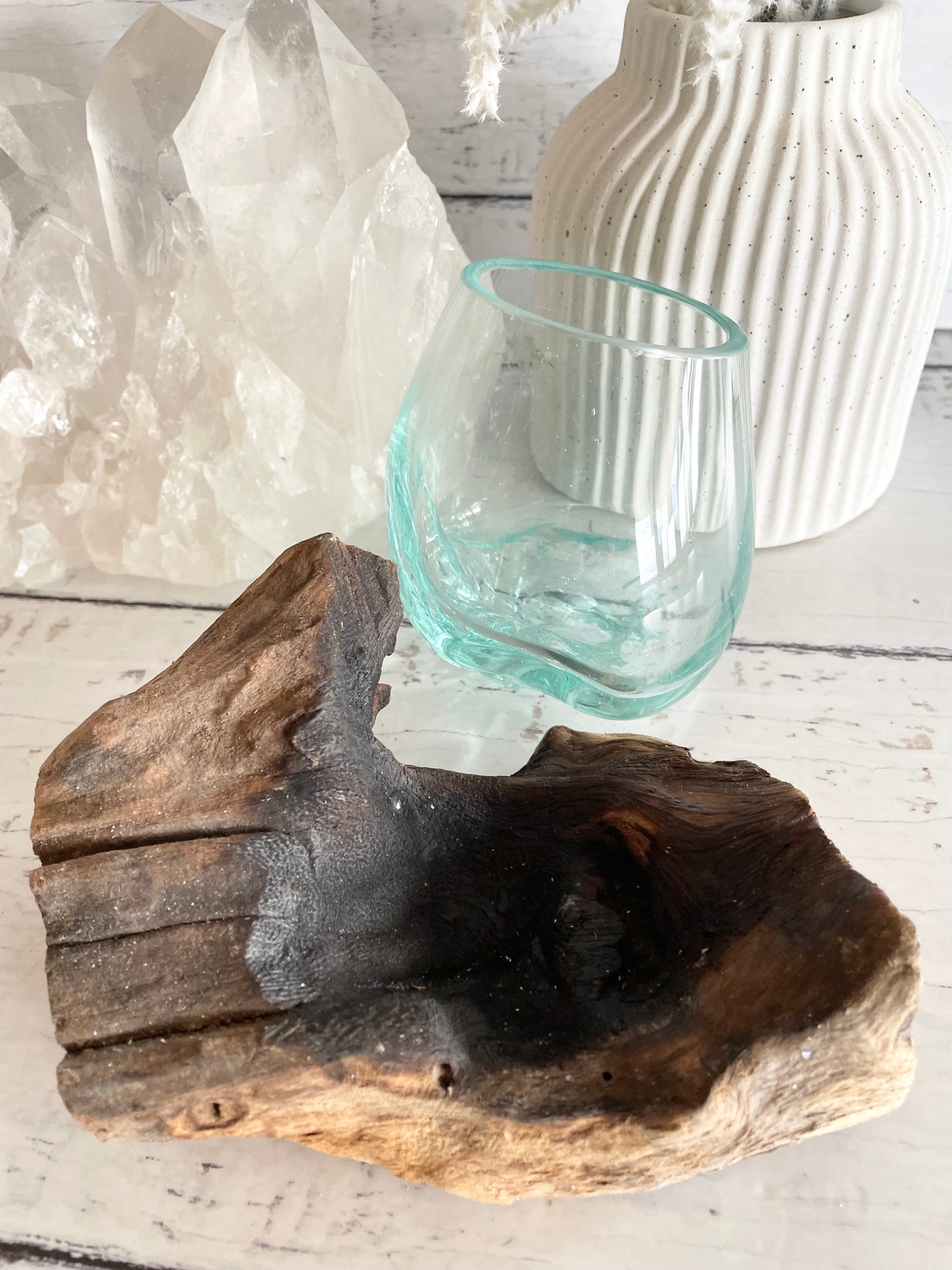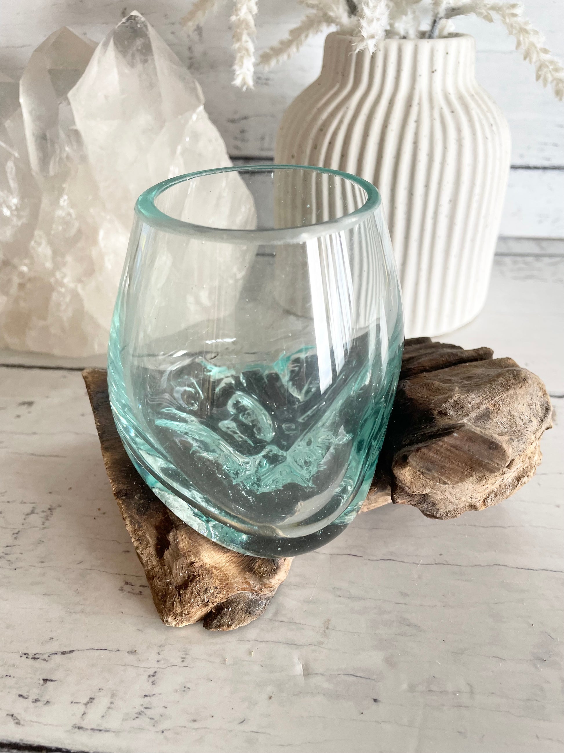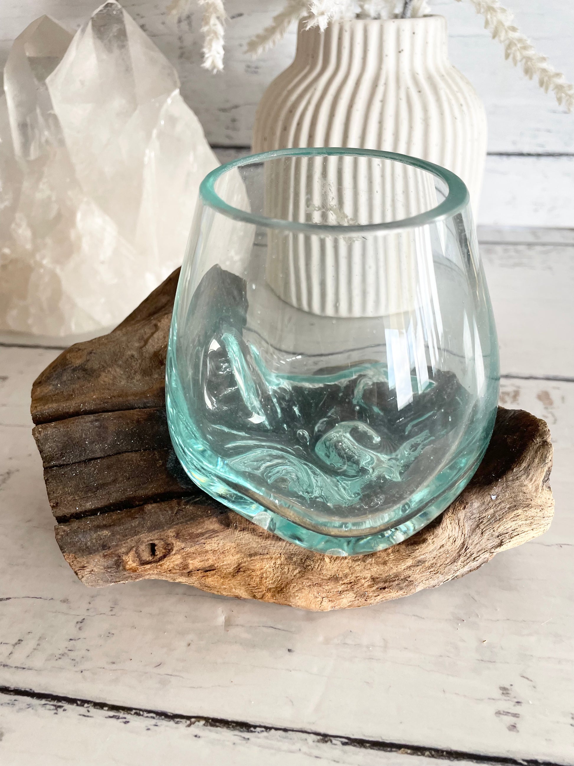 These amazing glass bowls showcase exquisite glass craftsmanship. Their base is adorned using lightweight, ethical collected driftwood. The glass rests securely in small grooves, perfectly positioned. I've used mine for plants, and they flourish. Particularly pothos in water!