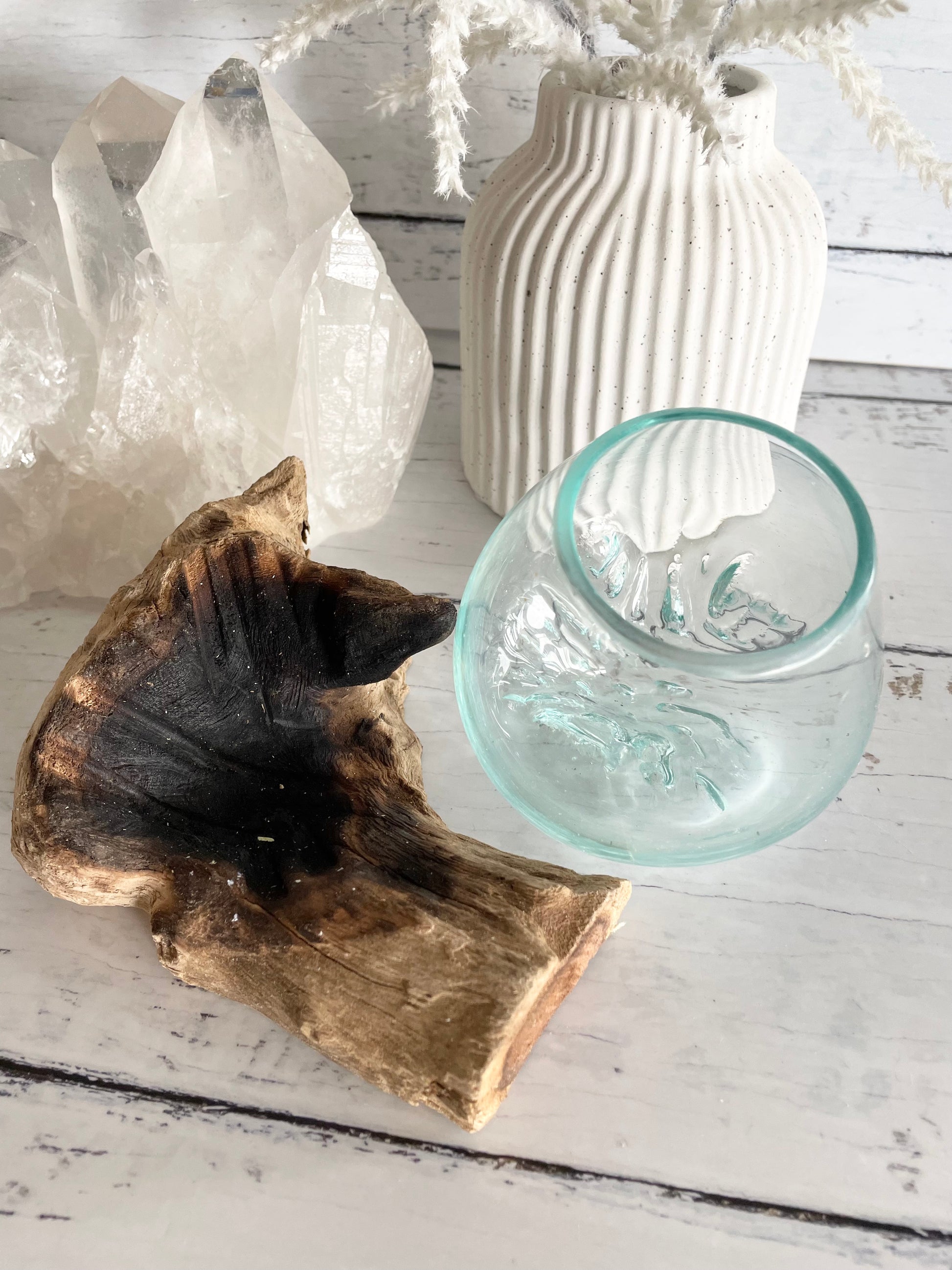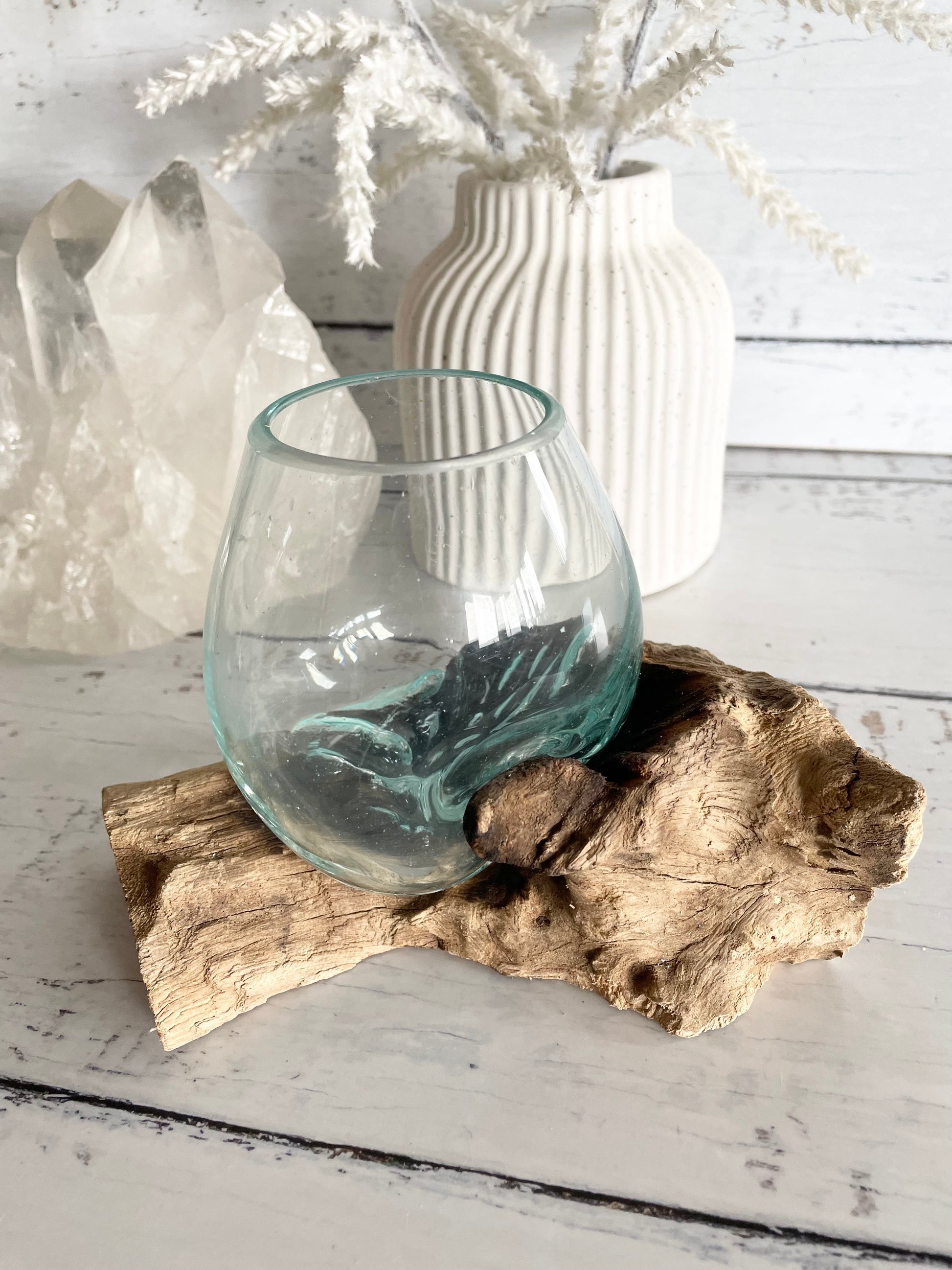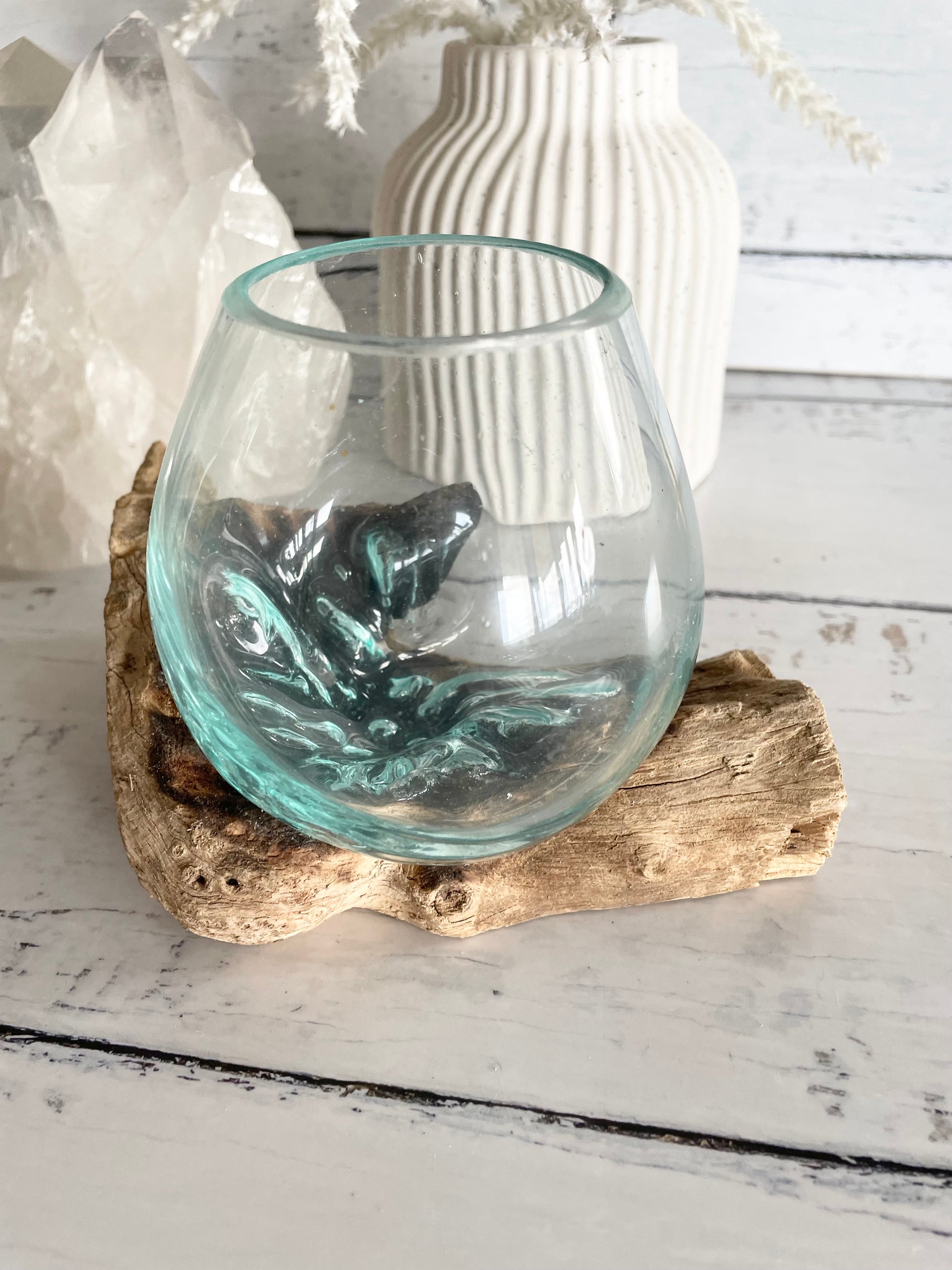 These amazing glass bowls showcase exquisite glass craftsmanship. Their base is adorned using lightweight, ethical collected driftwood. The glass rests securely in small grooves, perfectly positioned. I've used mine for plants, and they flourish. Particularly pothos in water!