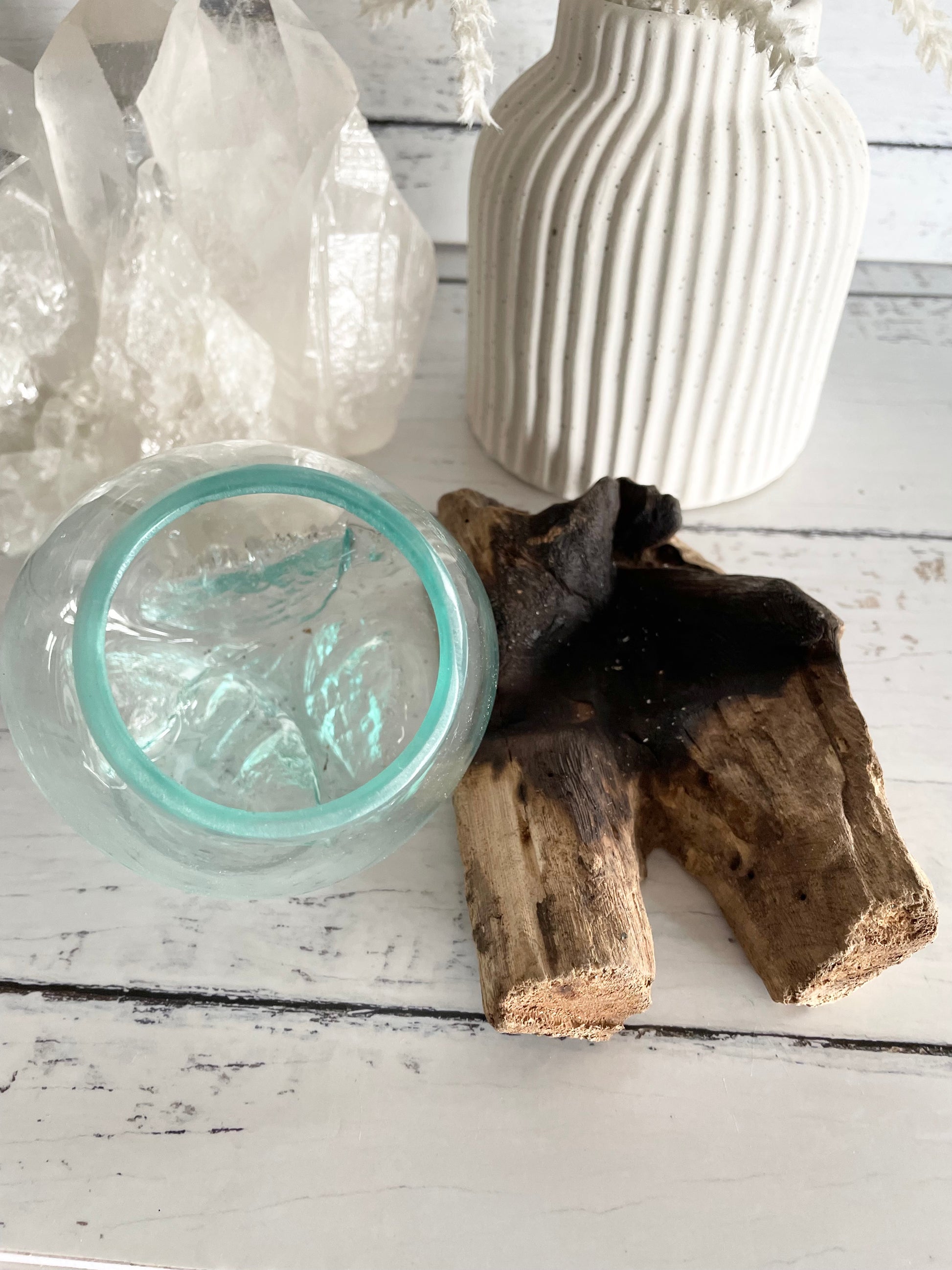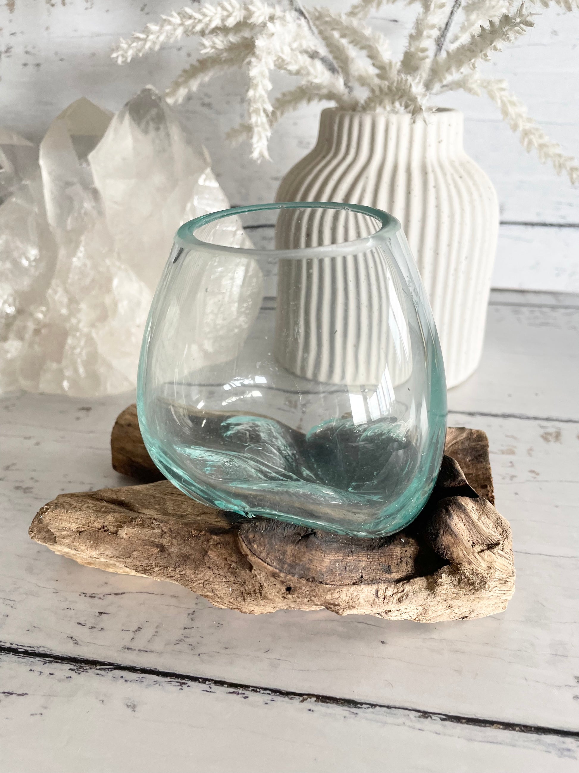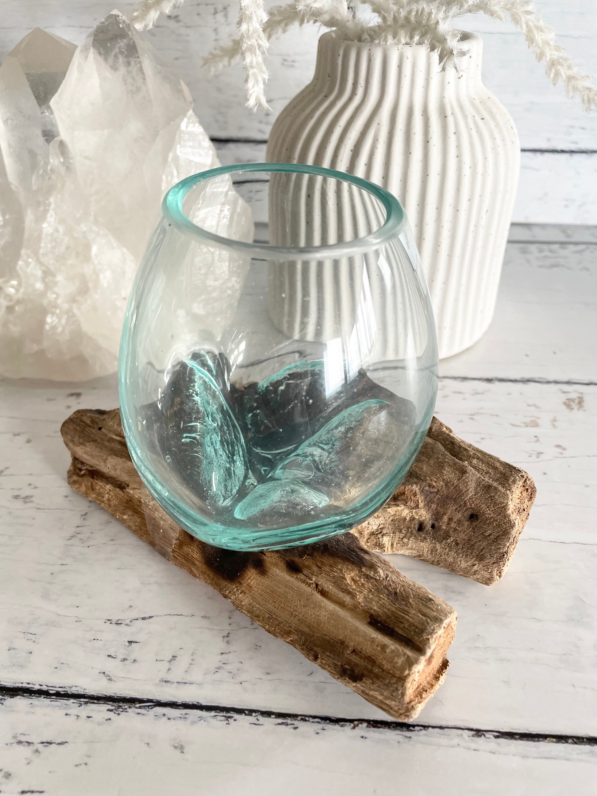 These amazing glass bowls showcase exquisite glass craftsmanship. Their base is adorned using lightweight, ethical collected driftwood. The glass rests securely in small grooves, perfectly positioned. I've used mine for plants, and they flourish. Particularly pothos in water!