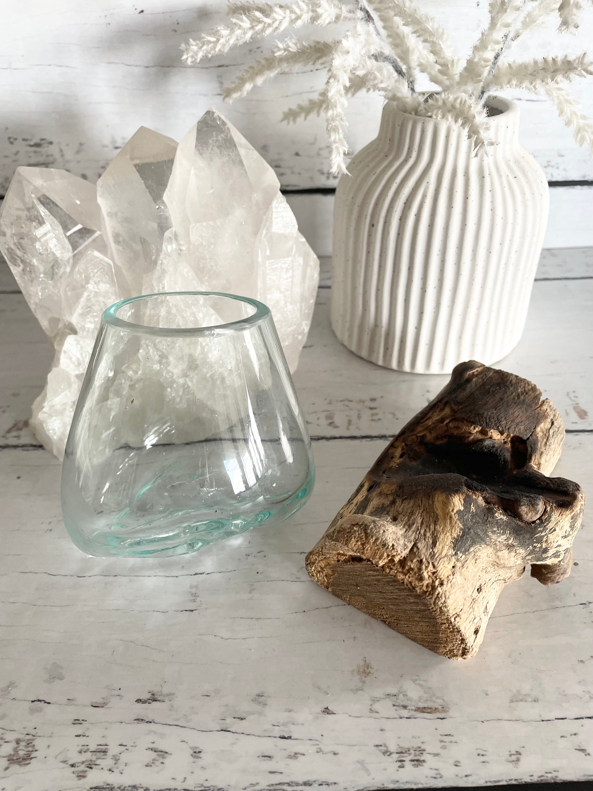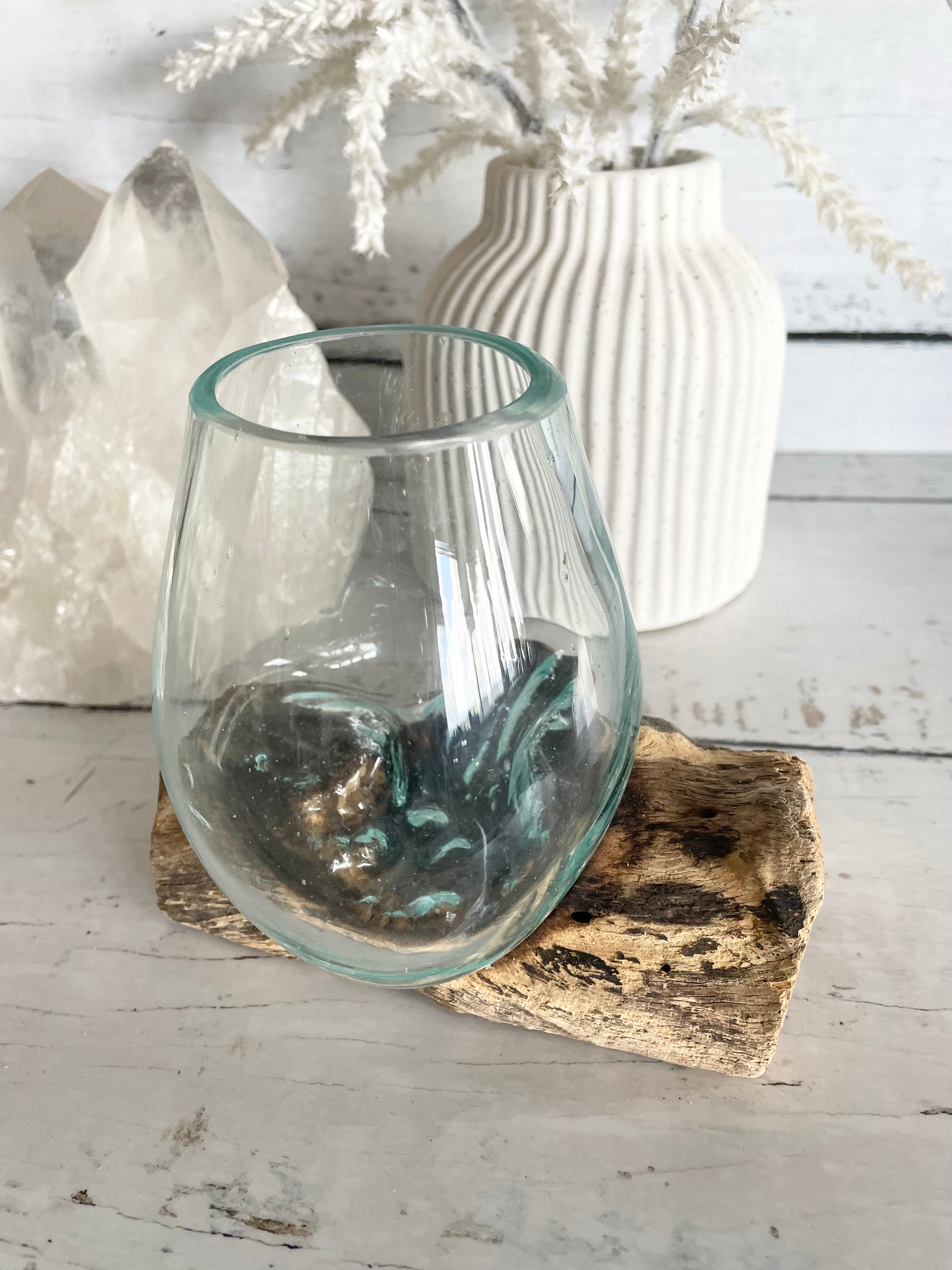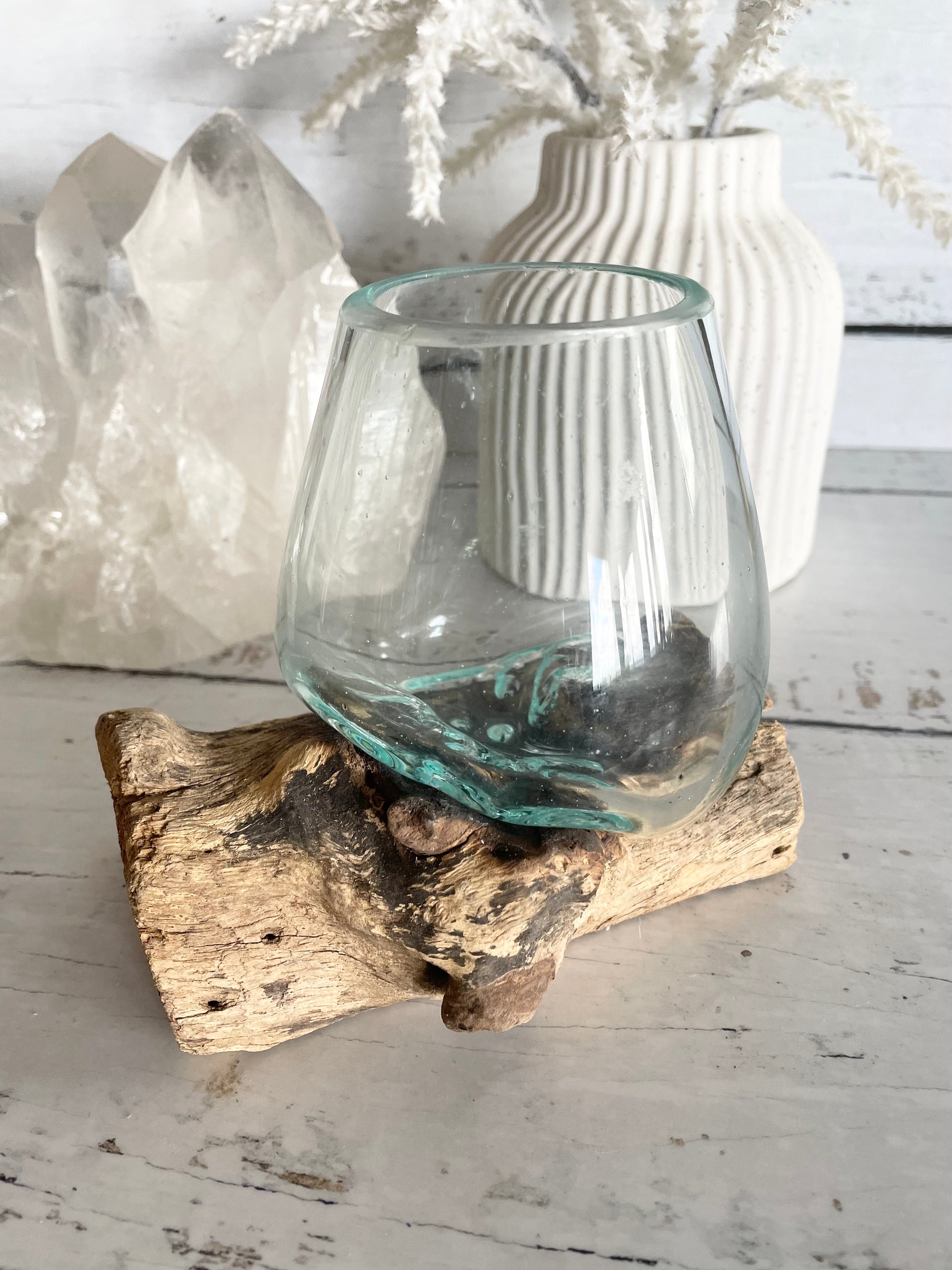 These amazing glass bowls showcase exquisite glass craftsmanship. Their base is adorned using lightweight, ethical collected driftwood. The glass rests securely in small grooves, perfectly positioned. I've used mine for plants, and they flourish. Particularly pothos in water!
