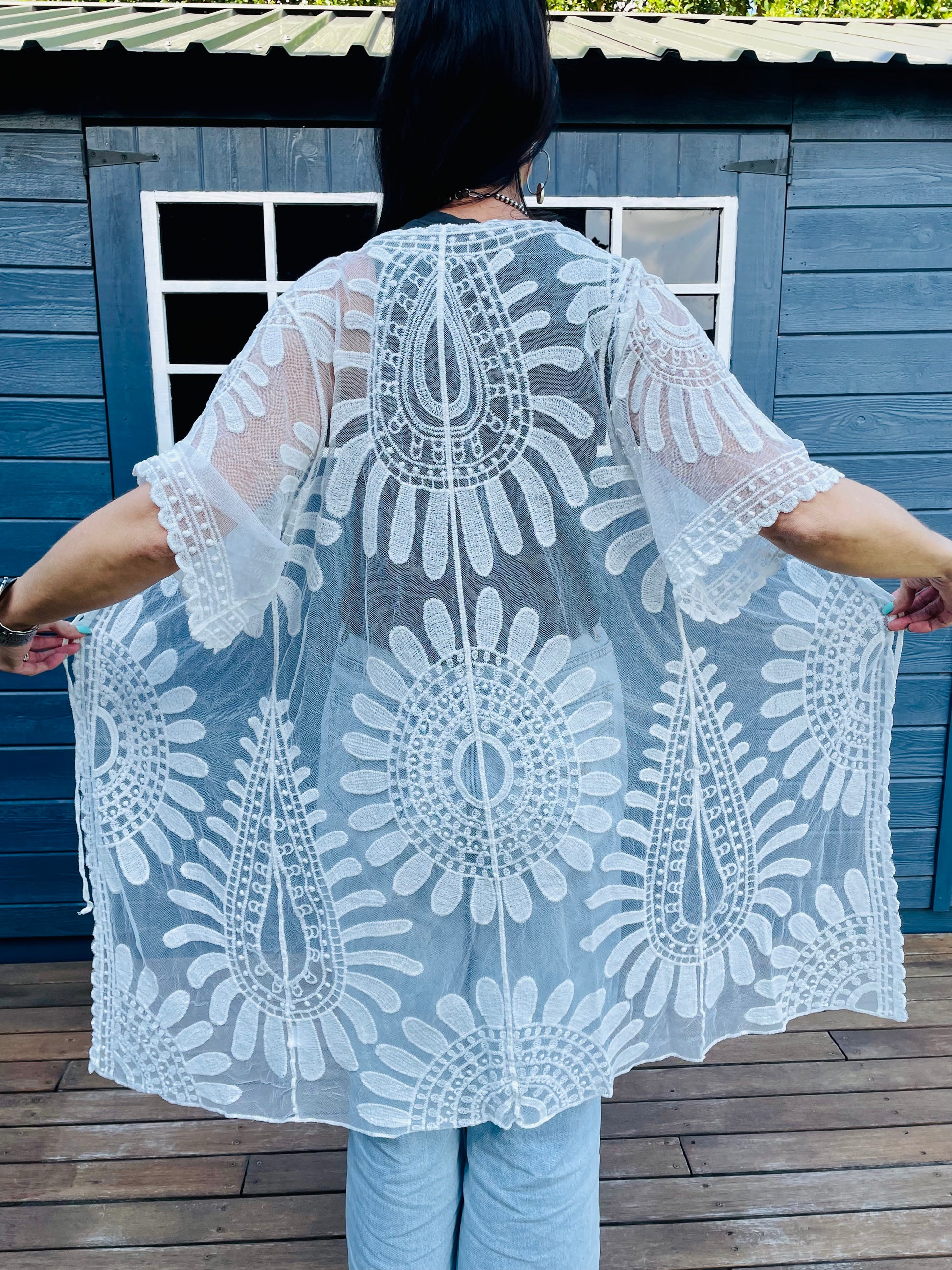 Get ready to slay the fashion game with our breathtaking lace dusters! These lightweight, long garments are perfect for adding a whimsical touch to your outfit. She is ethereal, flowy and perfect for spring/summer wardrobes!